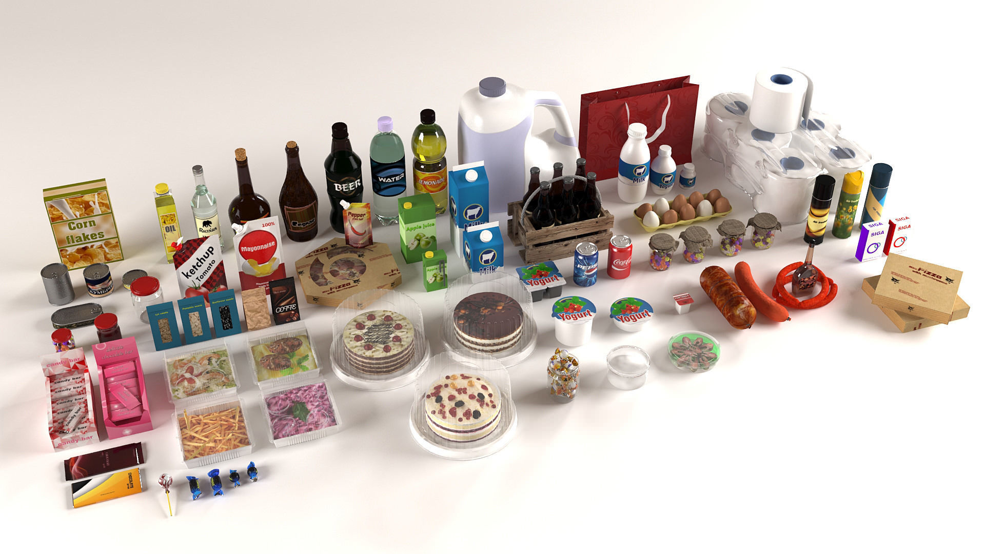 Cereal box.A bottle of sunflower oil.Bottle of vodka.Bottle of tincture.Bottle of wine.Beer plastic bottle.Beer glass bottle.Bottle of water.A bottle of lemonade.Milk Bottle.A Bottle Of Yogurt.Meat Seasoning bottle.Milk canister .Pepsi Cola jar.Jar of Coca Cola .Glass jar for canning large, medium, small (Jars differ in shape).Bank glass candy (rag cover different shape).A jar of metal (canned) large, medium, small, long.Air freshener (Cover, Spray).Tetrapak milk (Small, large).Tetrapak Apple juice (Small, large) + tube for juice.Yogurt 4 cups.Yogurt plastic jar (Large, small).Tray with chicken eggs.Seasoning, plastic jar.Pizza in a hexagonal box.Pizza in a square box .A case of beer with a handle.Ketchup.Mayonnaise.Chili seasoning.Plastic jar + with pieces of fish.Sausage .Ham.Sausages.Triangular packaging seeds 3 types.Triangular Coffee packaging.Triangular paper packaging.Plastic packaging: French fries, potatoes with cutlets, winter Salad, vegetable Salad,Cake 3 pieces.Box of bars.Chocolate tile 2 types.Candy 4 of a kind.Jar of sweets.Lollipop .Package for products.Toilet paper.Cigarettes.