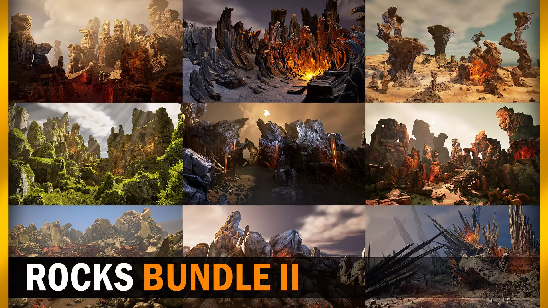 This pack include 9 of my others packages where you can find a ton of different rocks, cliffs and even small splinters in a differen styles for different biomes. All packages perfectly fit with any fantasy or fantastic environment. With this pack you can save 50% compared to buying packs separately. Totaly bundle keeps more then 390 different rocks and cliffs.