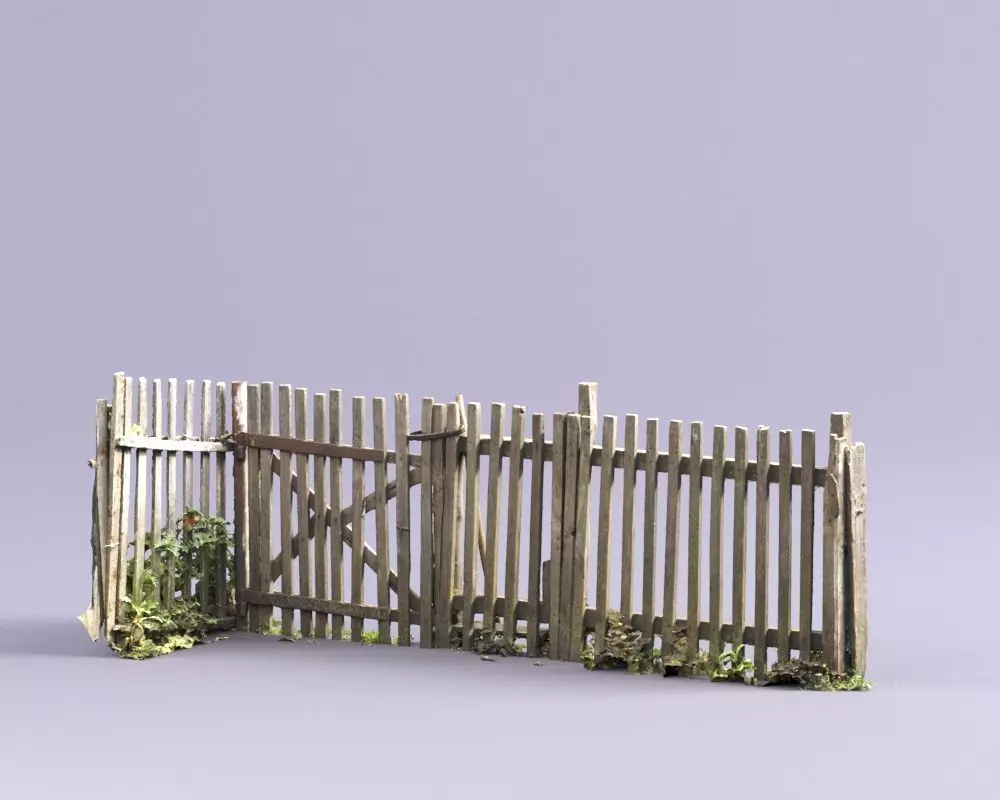The model includes a worn gate section, leaning fence planks, and ground vegetation — all scanned from an actual physical object for maximum realism. Perfect for open-world games, survival scenes, rural environments, and photorealistic visualizations.