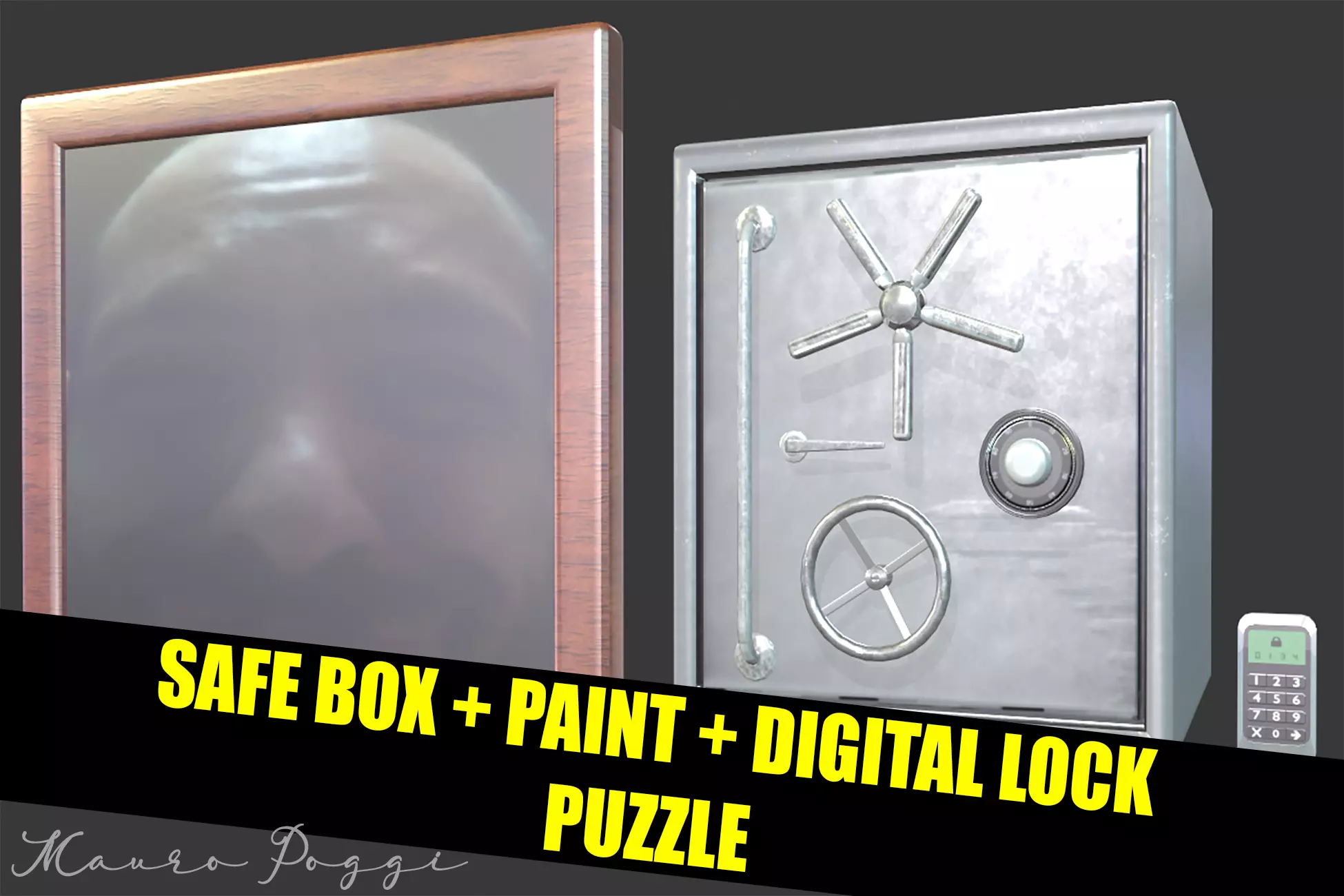 You can make a puzzle using the digital lock with the correct password, the paint will move and reveal the safe box which you will open with the correct combination of the safe box lock.