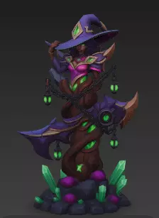 Destaques do ModeloTema de Halloween/Fantasia: Captura a essência da skin Bewitching com seus tons de roxo, verde-esmeralda e os elementos místicos. Senna está empoleirada em uma coluna de árvore retorcida, adornada com lanternas assustadoras e cristais.