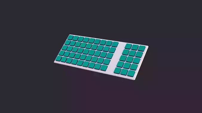 A clean, minimalist, and game-ready 3D model of a full-size computer keyboard. This asset features a low-polygon count, making it highly optimized for real-time applications such as video games, virtual reality (VR), augmented reality (AR), and stylized interior scenes. The design is a simple white base with distinct turquoise/teal keycaps, providing a modern, cartoon, or hypercasual aesthetic. It is suitable for various settings, including office environments, cyber setups, and stylized desktop scenes.