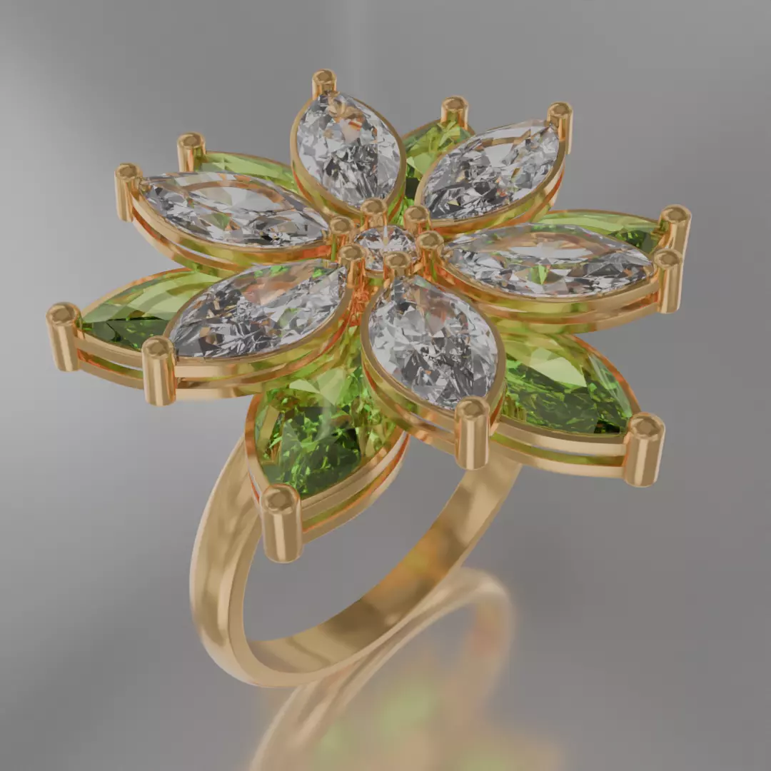 Description:This flower-shaped ring is a refined piece of jewelry design, created to combine natural harmony, vibrant elegance, and precise symmetry. The design is inspired by a blooming flower, where each petal is formed from large marquise-cut gemstones. Their sharp and clear lines reflect the light beautifully, giving the impression of movement and brilliance.