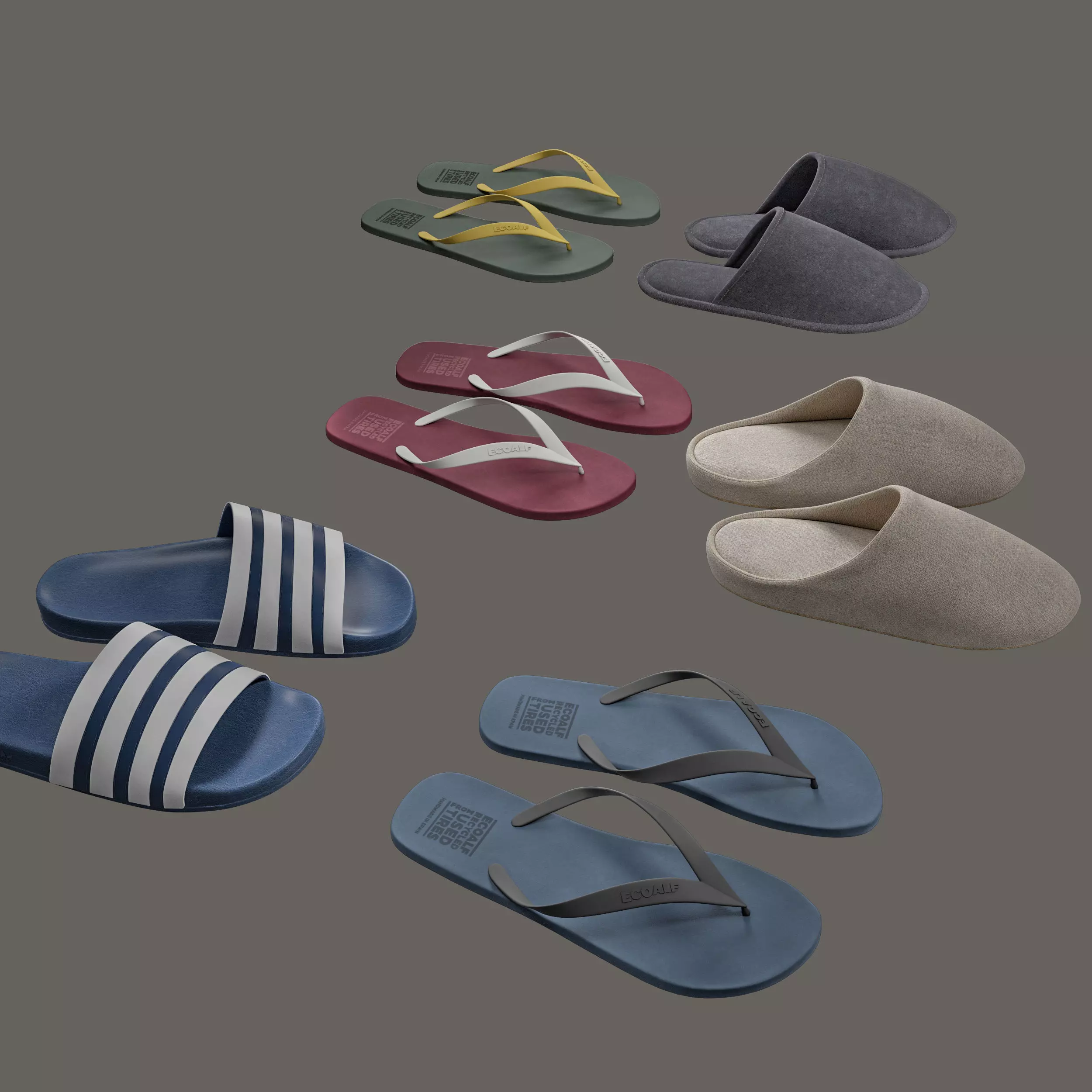 -ECOALF flip-flops: polys:14,506; verts:14,836-Navy Adilette Slides: polys:48,462; verts:49,336-Jersey Slippers: polys:37,450; verts:41,488-Linen Twill Slipper: polys:19,280; verts:18,948