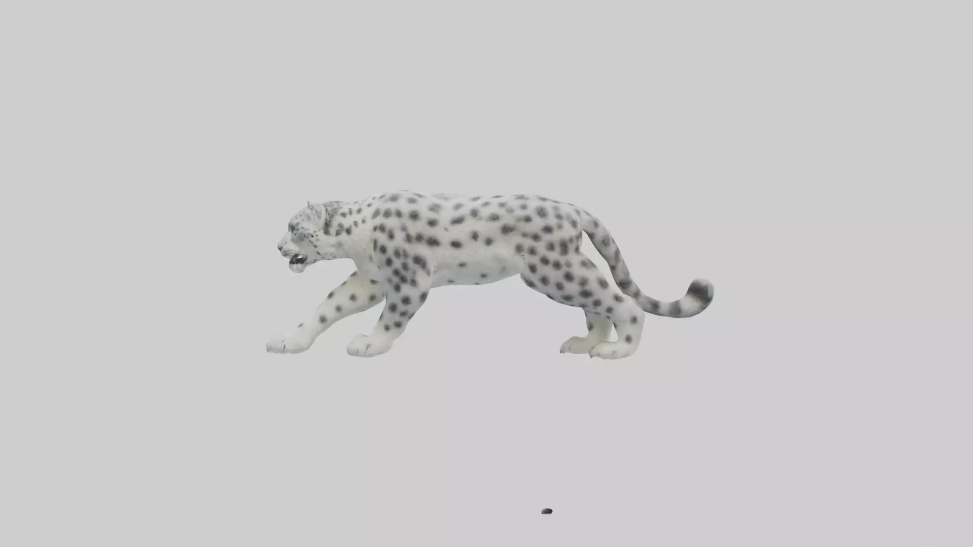 Concise 3D model of a Snow Leopard hunting. Depicts a Snow Leopard (Panthera uncia) in a hunting pose, such as stalking prey or leaping across rocky terrain. Showcases its thick, smoky-gray fur with dark rosettes, long bushy tail, and powerful, agile build adapted for high-altitude environments. Native to the mountainous regions of Central Asia. Known for its elusive nature and carnivorous diet, preying on animals like blue sheep and ibex. Suitable for wildlife, nature, Asian fauna, and educational visualizations. Available in FBX, OBJ, STL, GLB, USDZ, and BLEND formats.