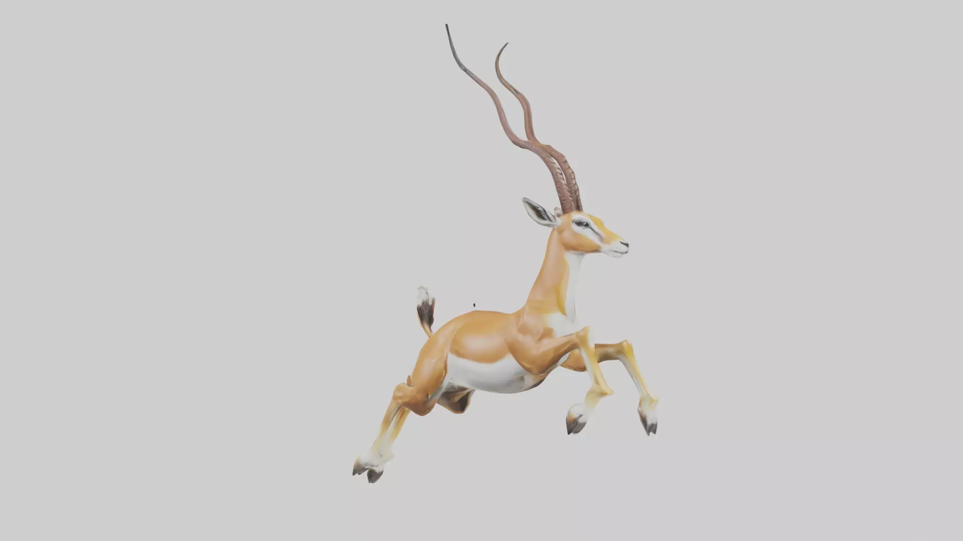 Detailed 3D model of a Springbok Hopping. This model accurately captures the characteristic pronking or stotting behavior of a Springbok, a medium-sized antelope native to southern Africa. The model depicts the Springbok in mid-air, with all four feet off the ground in a high, springy jump. The slender build, long legs, and graceful posture of the Springbok are accurately represented, showcasing its agility and athleticism. This 3D model is ideal for use in wildlife animations, educational materials about African fauna, game development featuring African wildlife, or any project requiring a dynamic and realistic representation of a Springbok in motion. The model is provided in multiple formats: FBX, OBJ, STL, GLB, USDZ, and BLEND, ensuring compatibility with a wide range of 3D software and platforms.