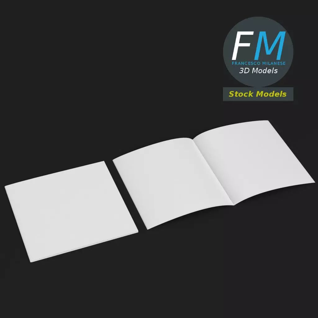 Square brochure mockups 3D Models; useful as templates (copy space) for ads or mockup-ups. 2 individual objects (closed, open), each one with its own non overlapping UV Layout map, Material and PBR Textures set. Production-ready 3D Model, with PBR materials, textures, non overlapping UV Layout map provided in the package.Quads only geometries (no tris/ngons).Easily customizable: UV unwrapped geometries, so you can create new Textures (or modify the existing ones) using the UV Layout maps provided in the package (as png with alpha).Each Object, Material or Texture provided in the package has a unique, meaningful name.Made in Blender 3D 2.80 (Cycles / Eevee materials) then exported to OBJ and FBX; materials and textures made in Substance Painter, exported for PBR, V-Ray, Unity, Unreal.PROMO IMAGES: the first image has been rendered in Cycles (or Eevee) for Blender 3D 2.8x; in particular, you can find 11+ promo images in this description: