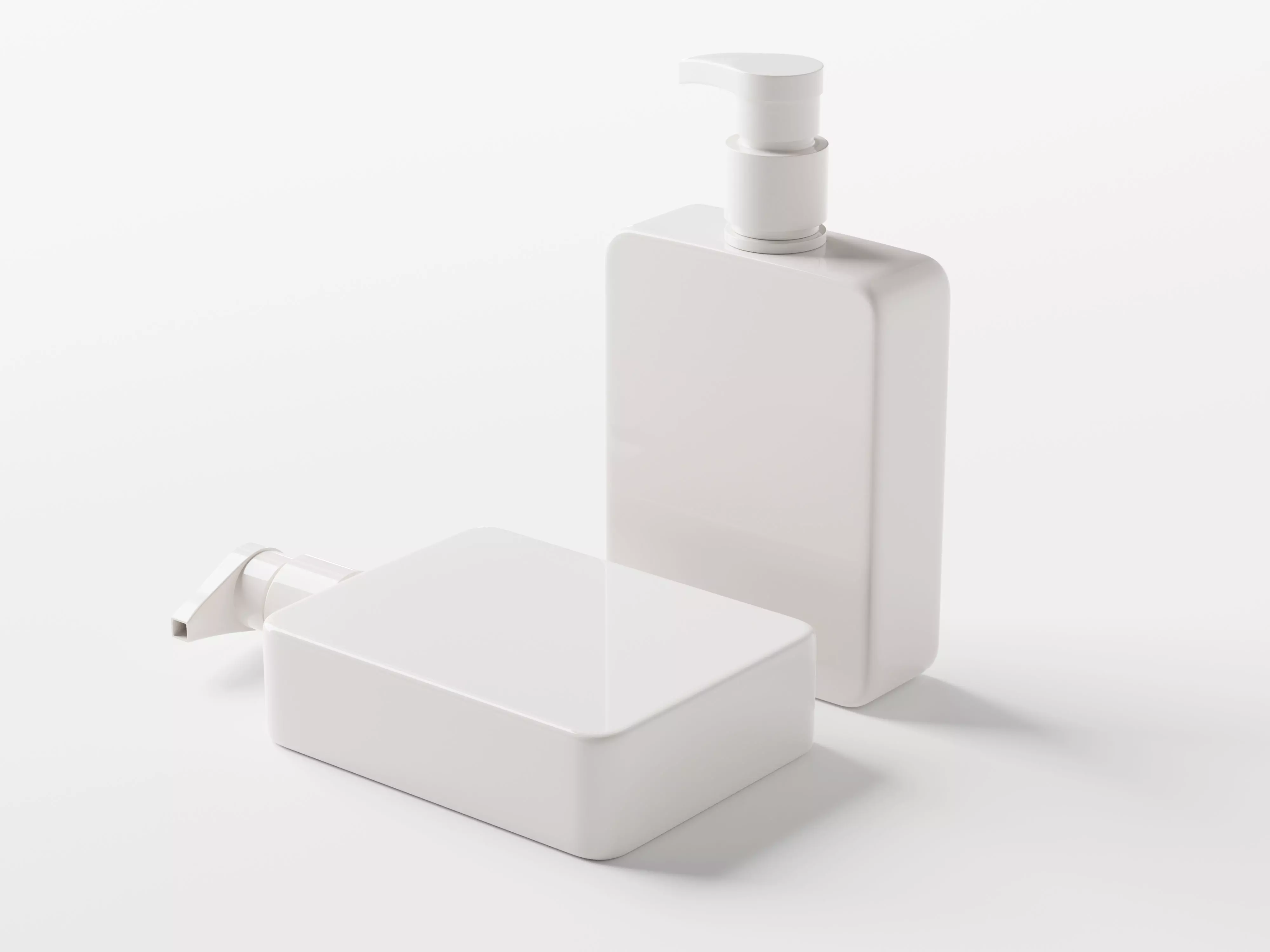 This is a 3D model of a commonly used type of pump bottle. bottle body is quare and flat. and the top closure is a regular pump.