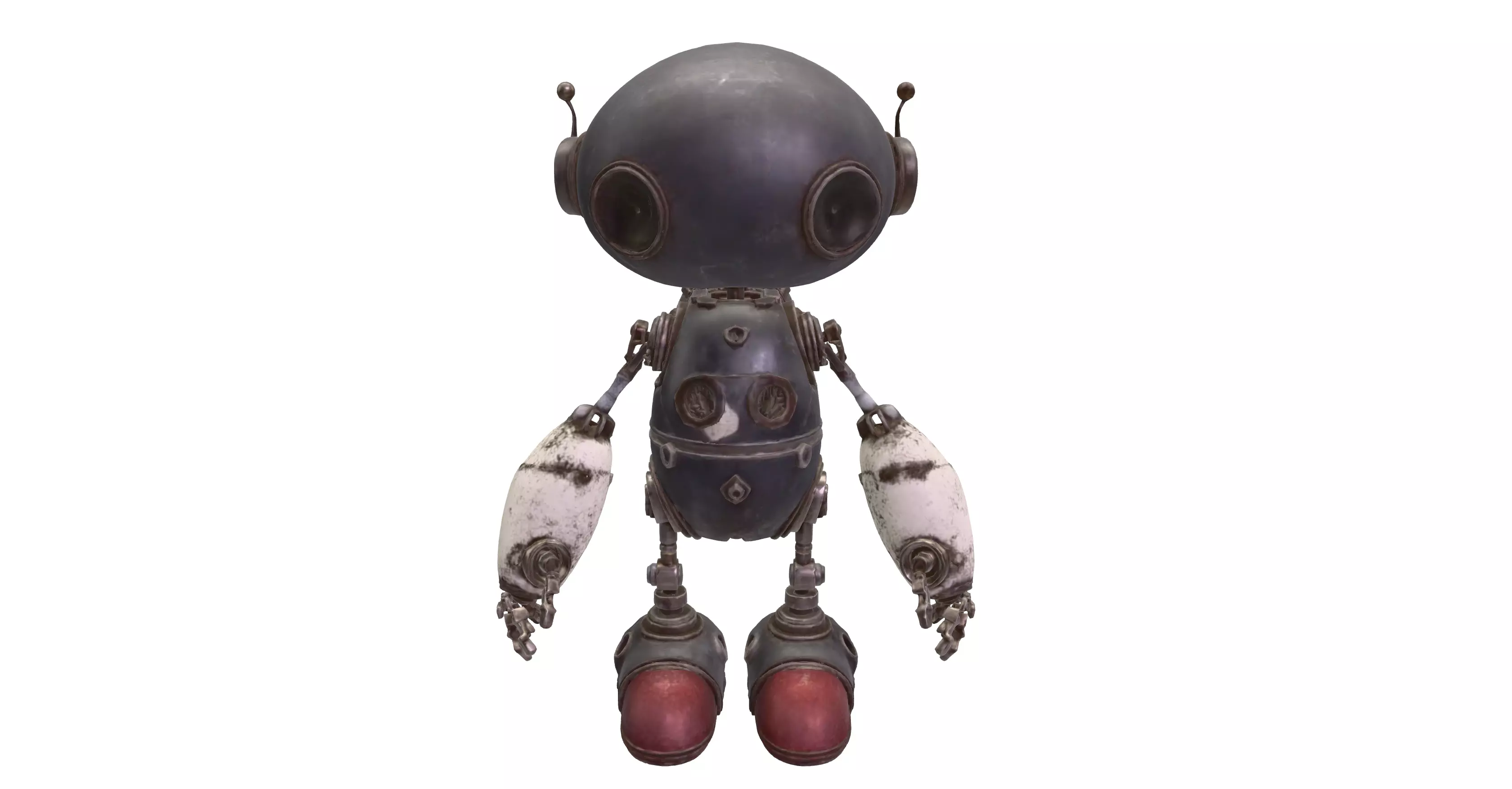 The body is constructed from layered metal plates, bolts, and exposed joints, all carefully detailed to convey a worn, industrial look. Subtle surface imperfections, scratches, and grime enhance realism, suggesting a robot that has seen years of service. The oversized arms and compact torso create a visually appealing silhouette, while the articulated joints allow for expressive posing and animation.