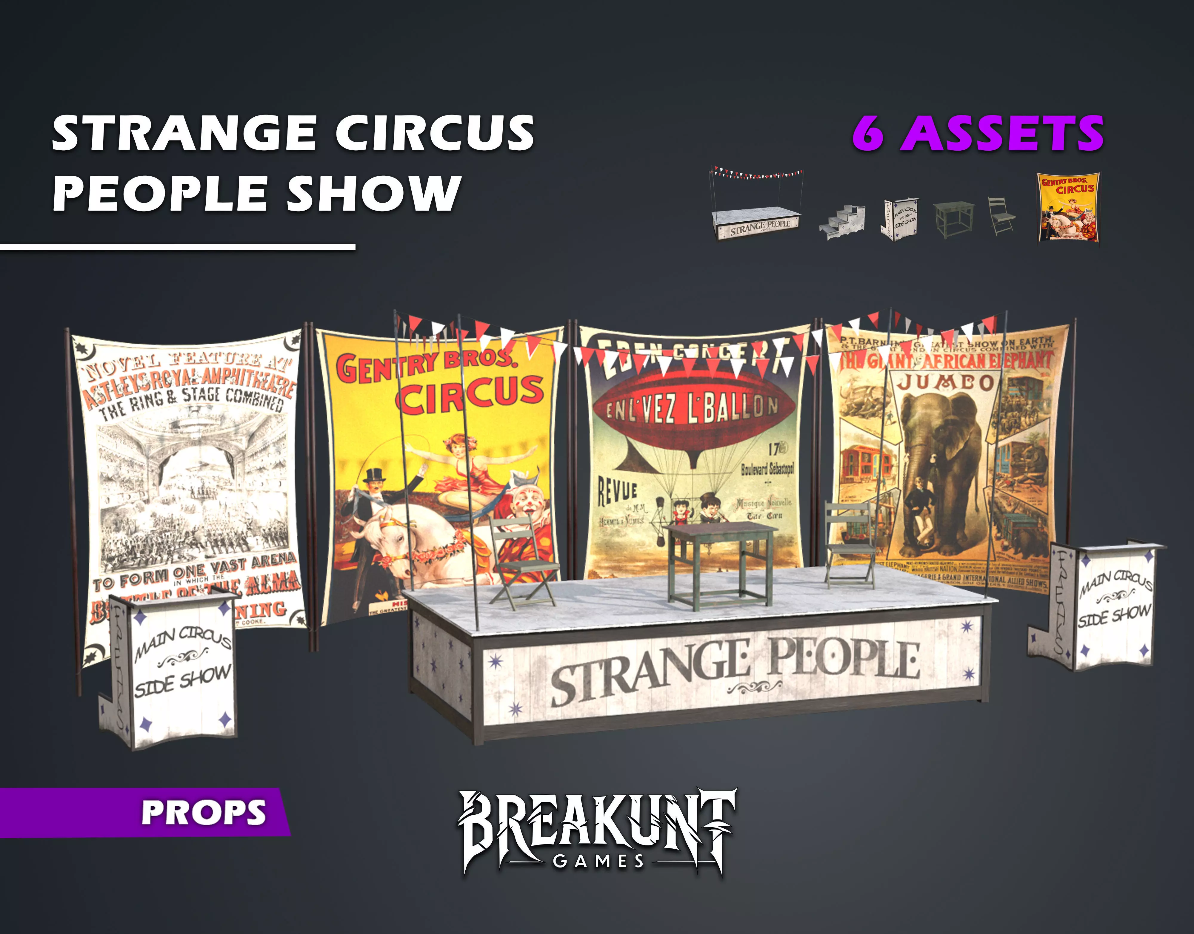 This 6-piece asset pack is perfect for creating an outdoor or indoor circus scene featuringa freak show stage. It includes stairs to access the platform, bunting garlands, apresenter's podium, a wooden table and chair, and a large decorative fabric panel with4 different designs. The set is realistic, game-ready, and perfect for any circus,carnival, or even a horror-themed show.