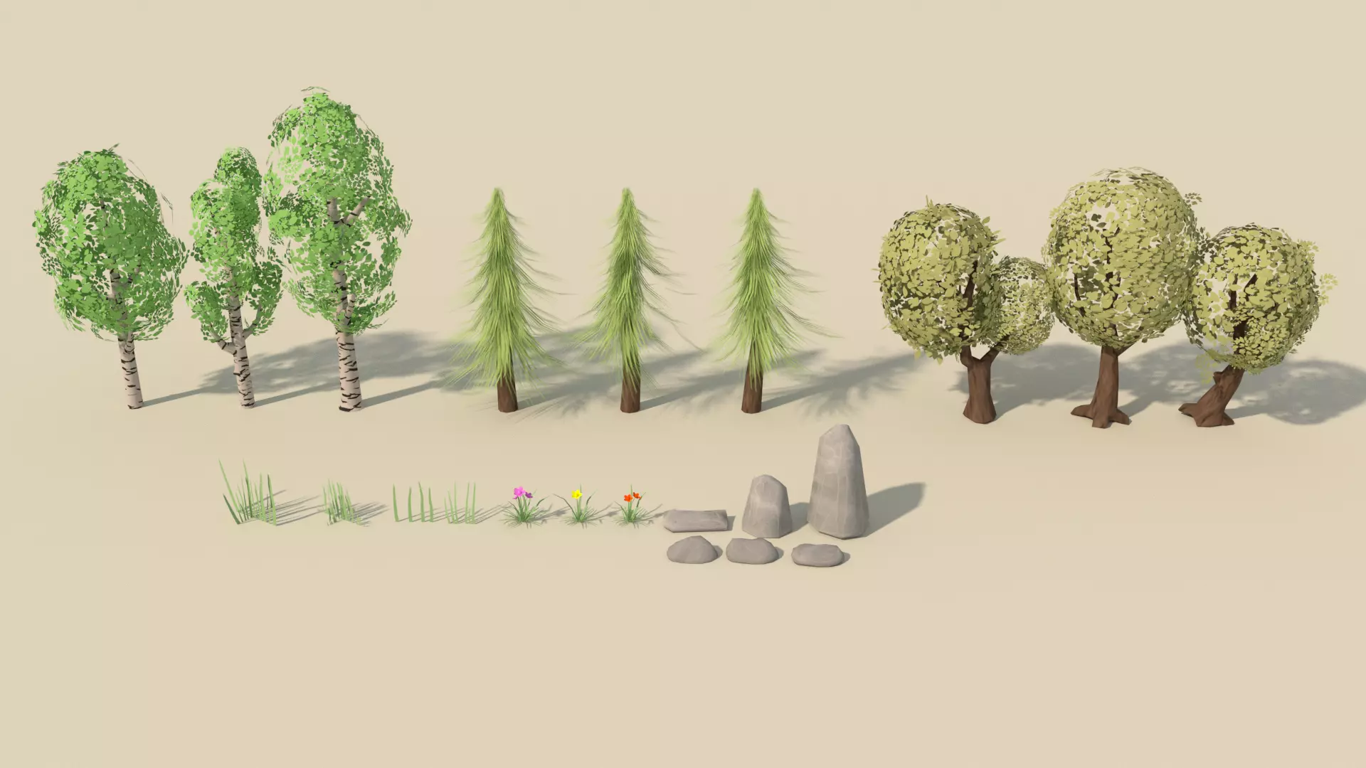 Game ready low-poly environment pack with PBR textures and customizable grass\leaves color. Trees are around 1k verts, all variants of grass are 8 verts, flowers are between 200-400 verts, stones are 20-80 verts. This pack comes in .FBX and .OBJ formats along with the original Maya save file. All assets and materials are named.