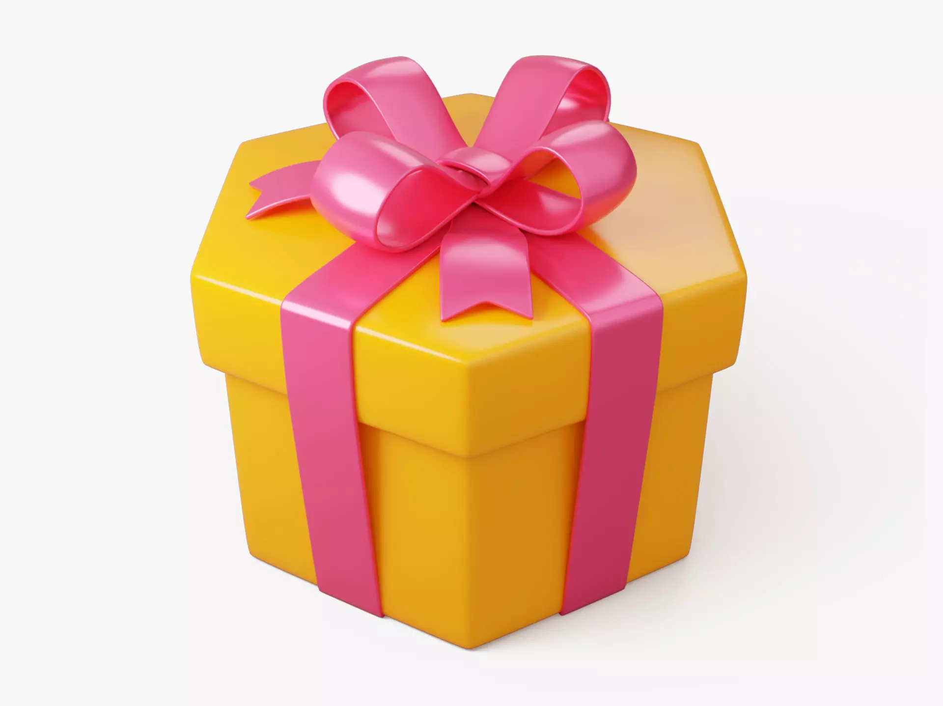 This is a stylized 3D gift box with a unique hexagonal (six-sided) shape, created in a vibrant cartoon style. It features a glossy yellow surface and a shiny pink ribbon with a large decorative bow. Perfect for use in birthday scenes, festive visuals, games, and cheerful illustrations. The non-standard shape makes it a standout piece in any stylized environment.