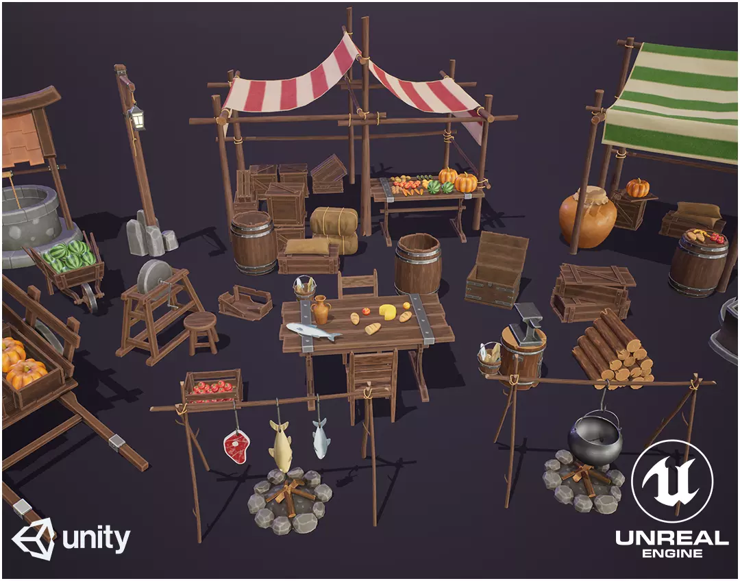 On this Stylized Package you will find more than 50 Medieval Props, including: Market Stalls, Blacksmith Tools, Boxes, Foods, Weapons and more. All to give a new look in your medieval scene!