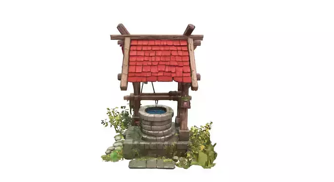 This detailed stylized medieval well is a charming environmental prop designed to fit seamlessly into fantasy villages, RPG towns, or storybook-style game worlds. The model features a sturdy stone well base surrounded by subtle ground details, including moss, small stones, and vegetation, giving it a lived-in, natural look that enhances realism while maintaining a stylized aesthetic.