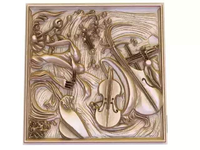This embossed artwork is a wordless poem celebrating the harmony of art and music. The violin, carved amidst golden volumes, seems to cradle a moment of eternal melody. Each musical note, like a droplet of golden light, dances around this majestic instrument, dissolving the boundaries between sound and silence, between seeing and hearing.