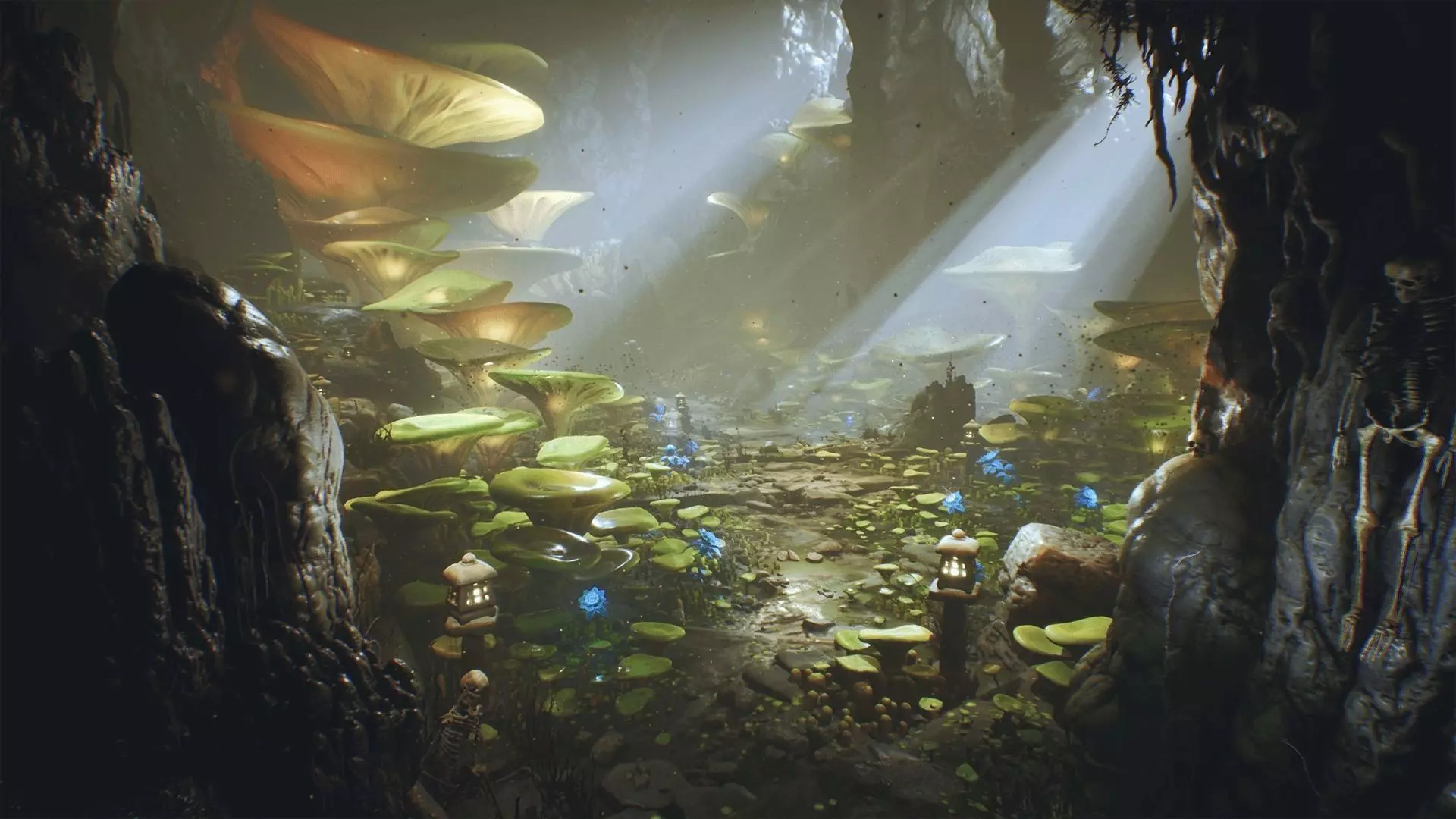 The Deep Elder Caves contains assets in different variations such as walls, arches, floors, pillars, rocks, tiny habitat statues, coins, chests, mushrooms, ancient fallen head statues, roots (mesh + alpha), shrubs, a skeleton set (solid in different poses + piles, skulls) and other smaller stuff. Perfect for use in fantasy RPG\Actions games. In the demonstration map you will find different examples of usage: either as a dark, classic cold cave, or something warmer with mushrooms and a fantasy vibe.