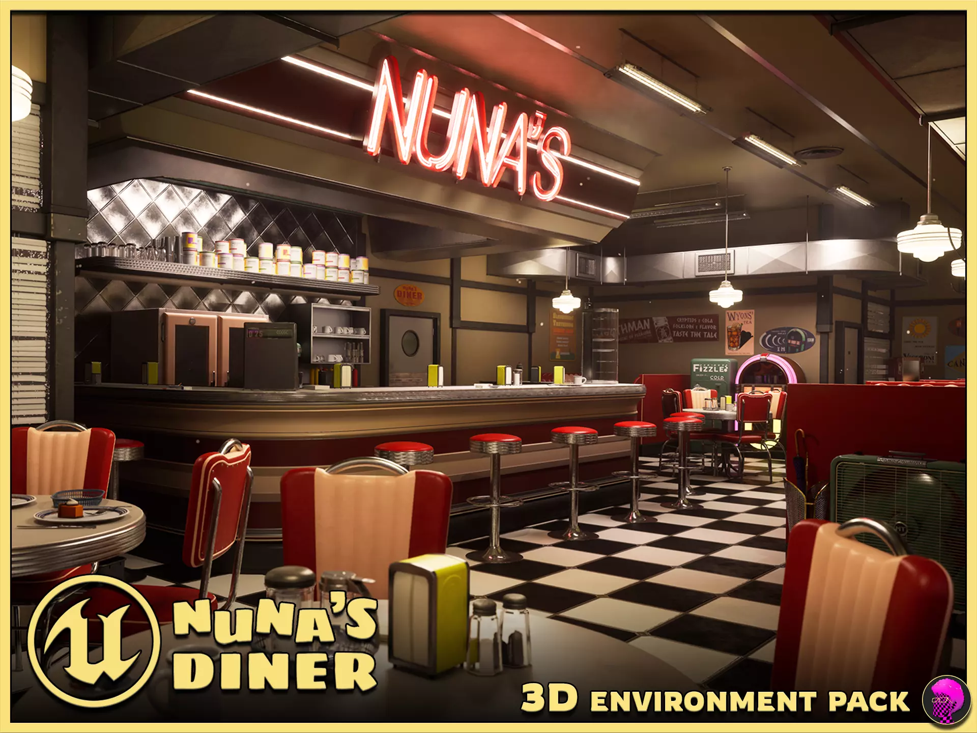 Note: The Unreal Project files, demo map, and SBSAR files are only included via purchasing through Fab. If you would like these added benefits please redirect to my Fab store. Nuna's Diner is an interior-oriented environment pack. The modular architecture mirrors, so interior walls double as exterior walls. This asset pack was made with poly count and lower-end machines in mind; all assets are tailored accordingly. The poly count range is 12-30,000 and vertex count range is 16-35,000.