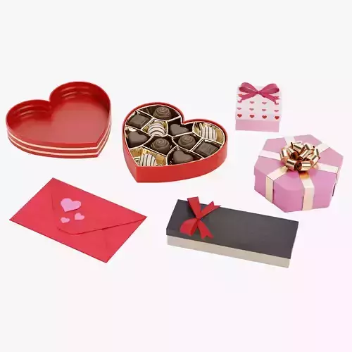 A focused set of Valentine-themed props designed for fast integration into scenes and renders. At the core of the collection is a heart-shaped chocolate box filled with individually crafted chocolates, supported by elegant gift boxes and a decorative envelope. Each prop is built with consistent materials, clean geometry, and brand-neutral design, allowing seamless integration into a wide range of visual styles and storytelling contexts.