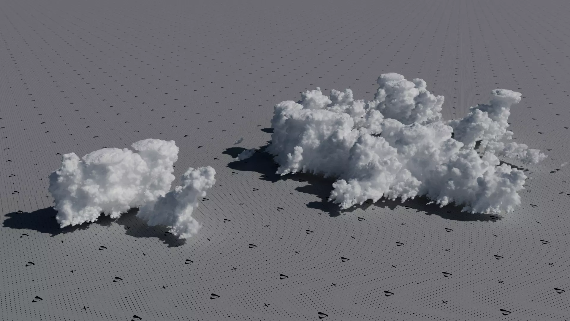 Due to our satellite data-based cloud field simulations, we are able to create much more realistic large-scale, multi-cloud formations, which outperform traditional cloud VDBs in scenes like: