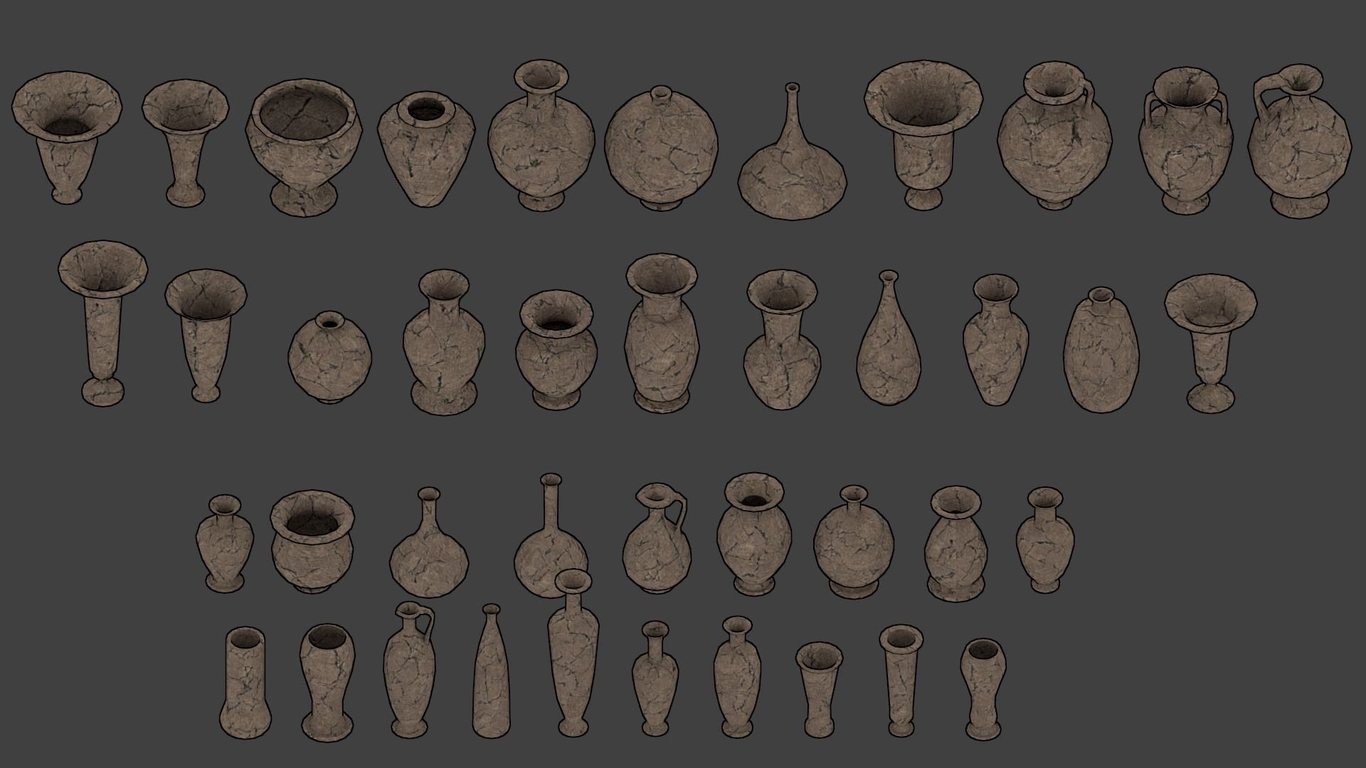 41 different ceramic pieces for your use.Vertex count goes from a maximun of 561 and a minimun of Minium 273Icluded base texture