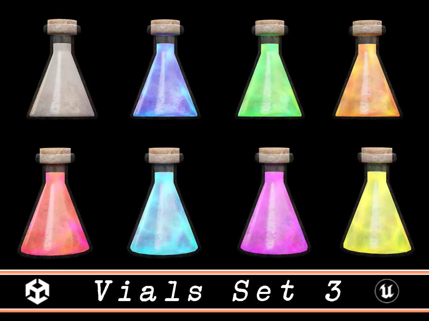 Vials Set 3 - 8 Color Variations 3D Model. This model contains the Vials Set 3 - 8 Color Variations itself
