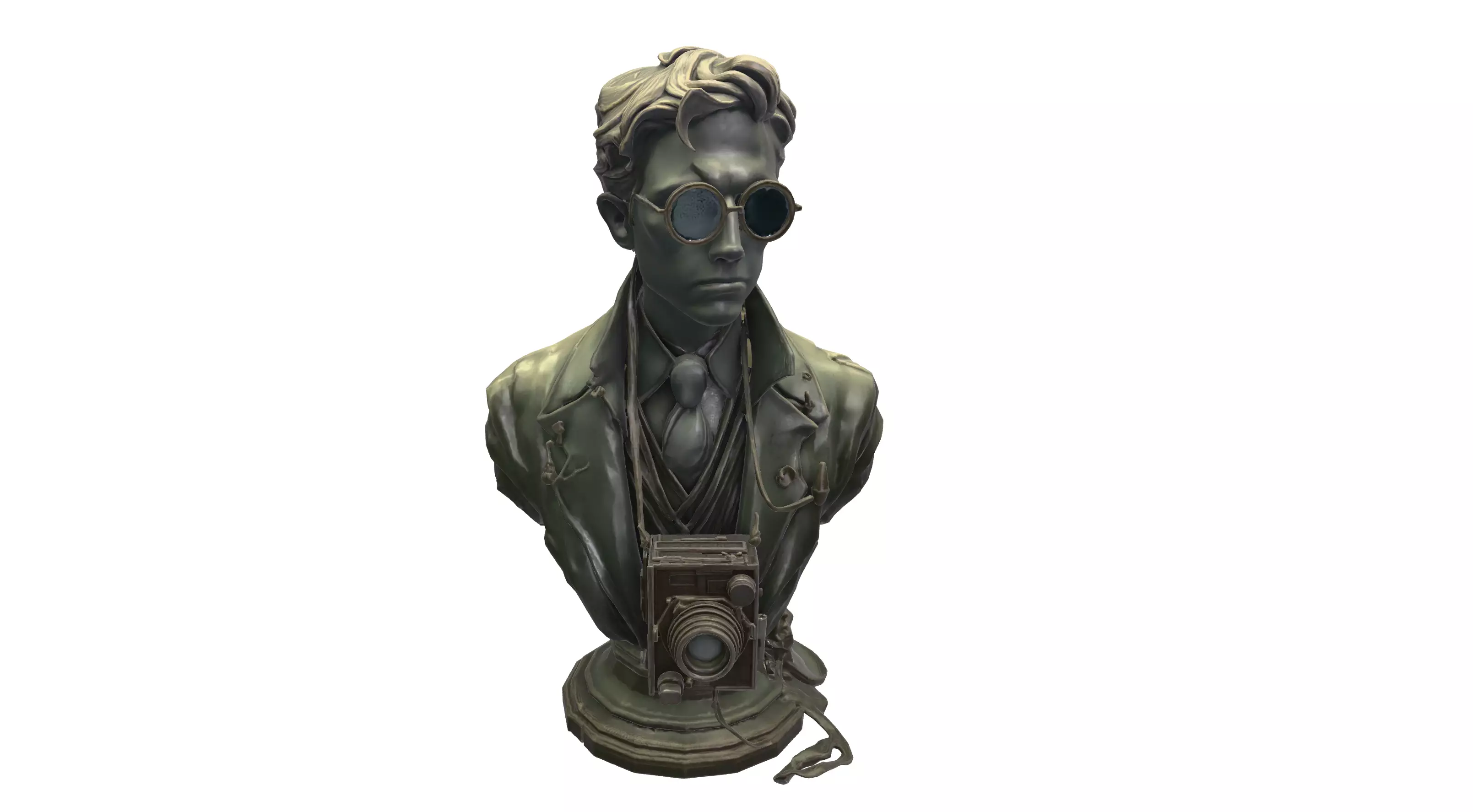 This highly detailed 3D model represents a Victorian-era photographer captured in the form of a classical bust, blending historical elegance with a subtle steampunk aesthetic. The character features refined facial anatomy, period-accurate hairstyle, and round vintage goggles that immediately evoke late 19th-century scientific and artistic exploration. The sculpted expression and posture give the bust a contemplative, intellectual presence, making it ideal as a narrative-driven prop or decorative asset.