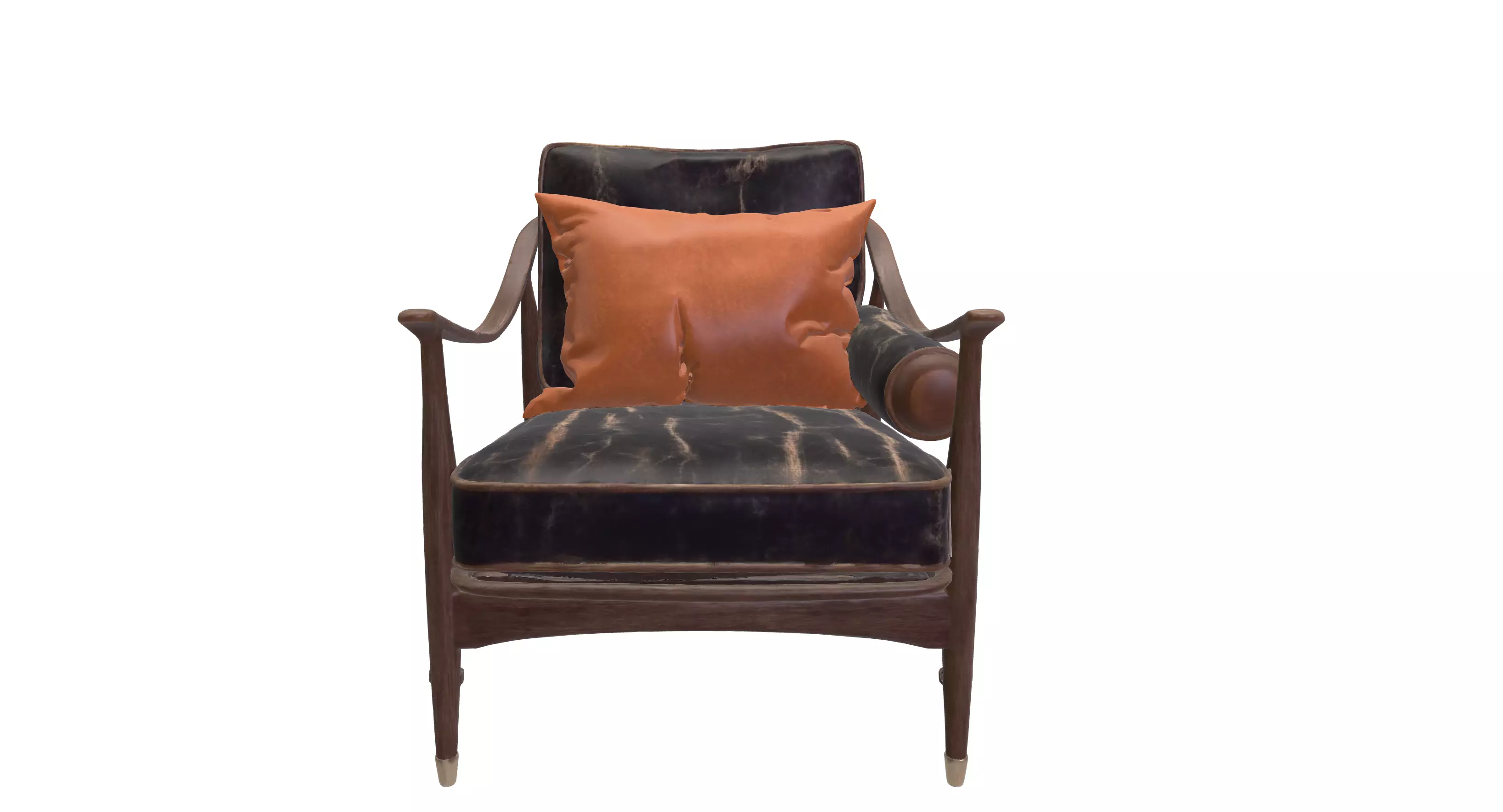 Included with the armchair are two accent cushions: a bold burnt-orange square pillow that adds a vibrant pop of color, and a cylindrical bolster cushion with matching leather tones that complements the chair’s overall aesthetic. These additional elements enhance the visual storytelling potential of the asset, making it suitable for modern, retro, or eclectic interior scenes.