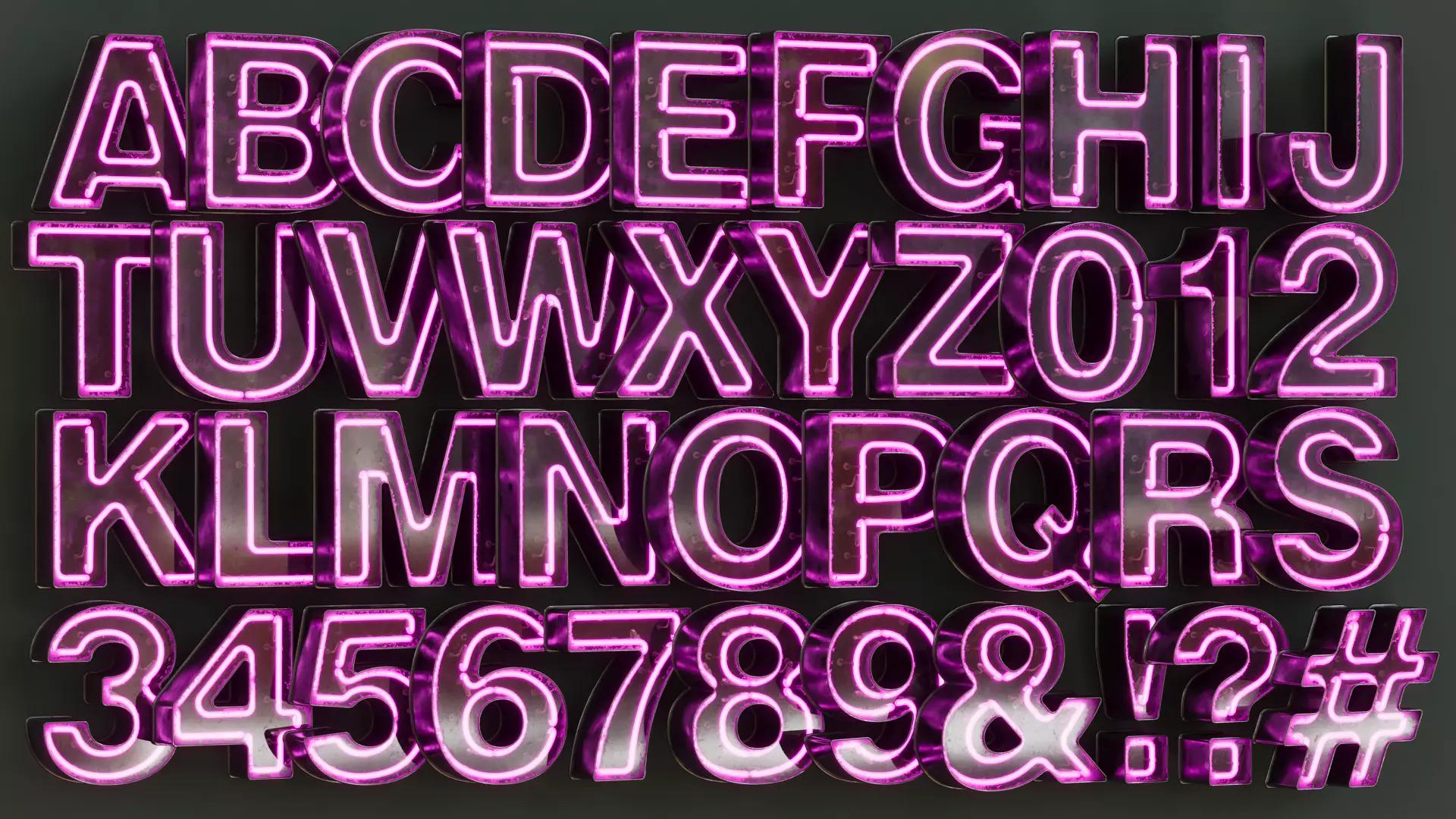 Pack of highly detailed realistic vintage vintage neon metal letters, numbers and special symbols 40 pieces. Black rusty metal case with pink neon.