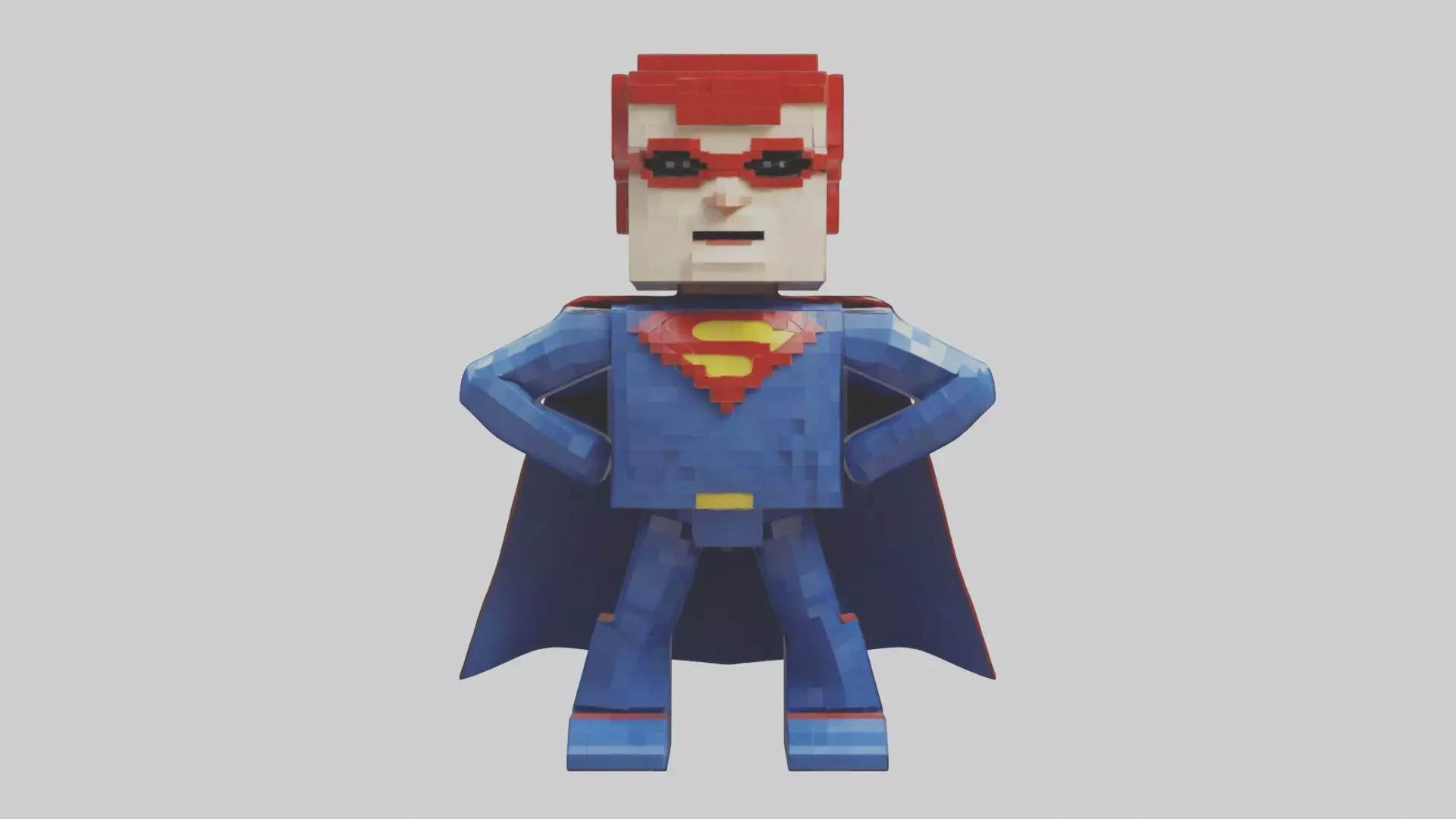 superbohater, model 3D, sztuka woksela, postać superbohatera, peleryna, maska, emblemat bohatera, pikselowa figura, bohater akcji, retro design, gra przygodowa, postać w woksela, symulacja superbohatera, zasób gry, 3D superbohater