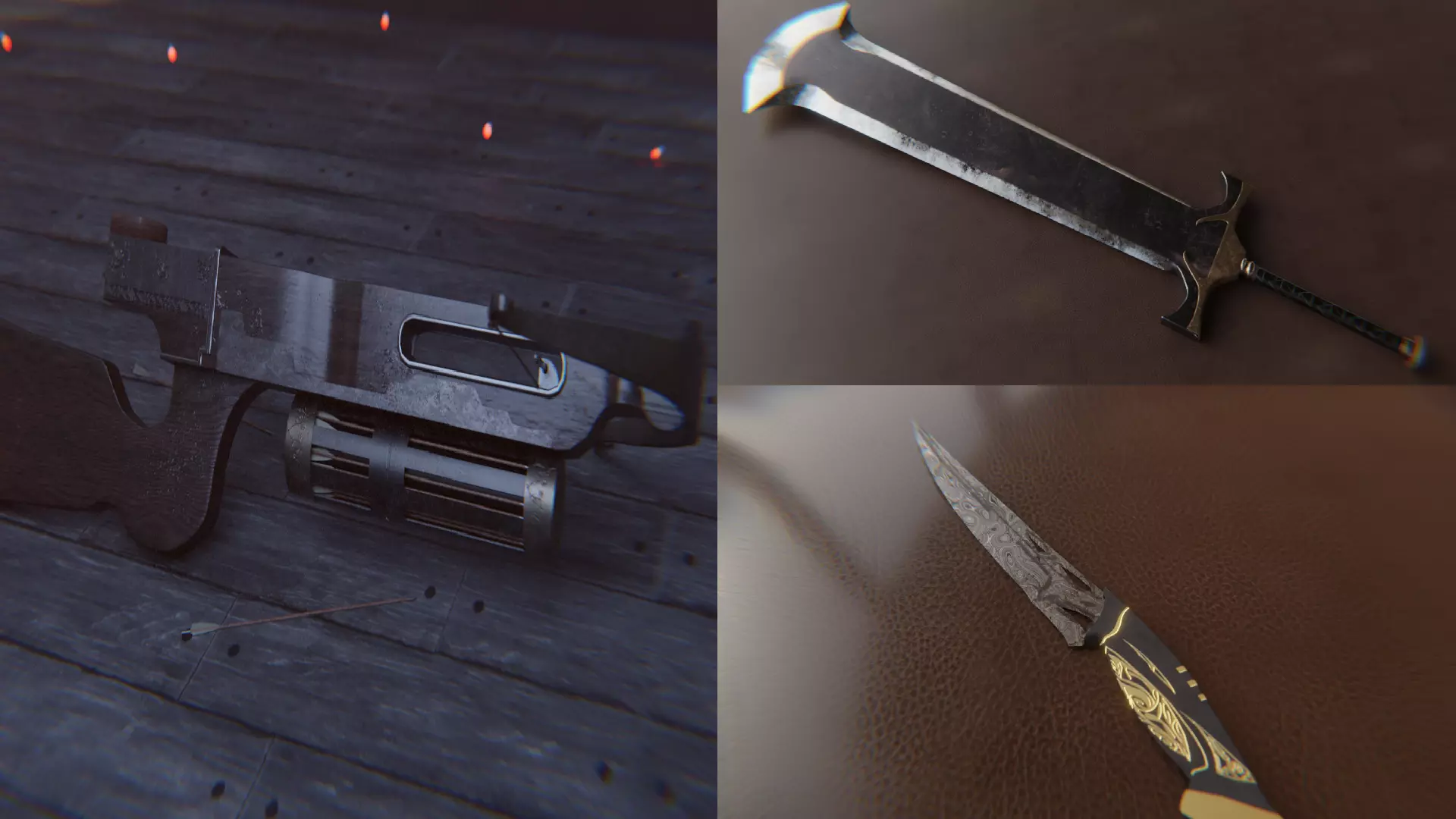 Contains all the required textures and assets need for a game assest while bieng a low poly model with high detailed textures giving the looking without reducing the performance each weapon has its own level of damage which gives it a realistic look all the 3d models texture have been made and hand painted in substance painter the substance painter files are also provided in the zip file the RAR contains