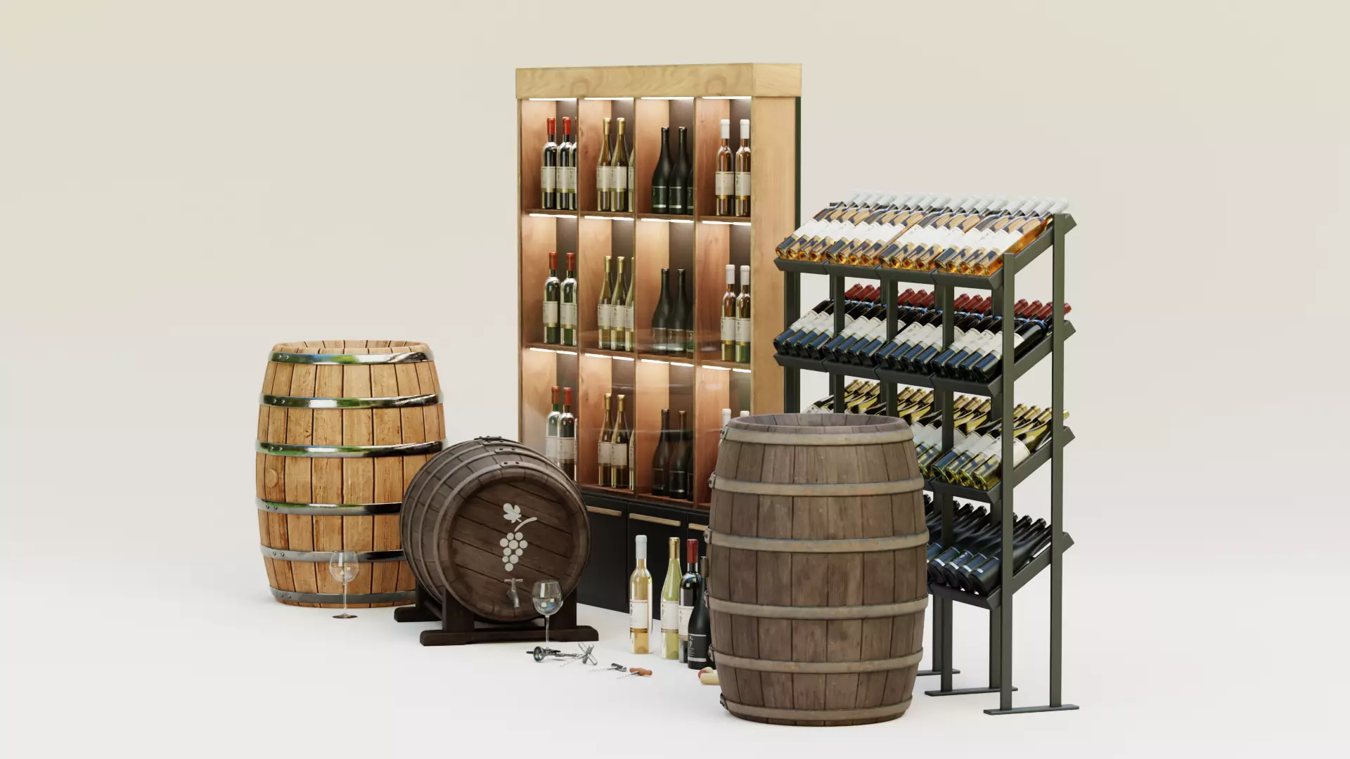 A comprehensive wine-themed 3D collection combining bottles, large-scale storage systems, barrels, and essential accessories into one cohesive asset library. The set includes a full lineup of red and white wine bottles with original concept labels, illuminated and modular display units, multiple corkscrew variations, cork details, wine glassware, and barrel types in both refined and aged finishes – including a tapped configuration. Designed to support complete wine shop, tasting room, cellar, hospitality, and product visualization scenes.