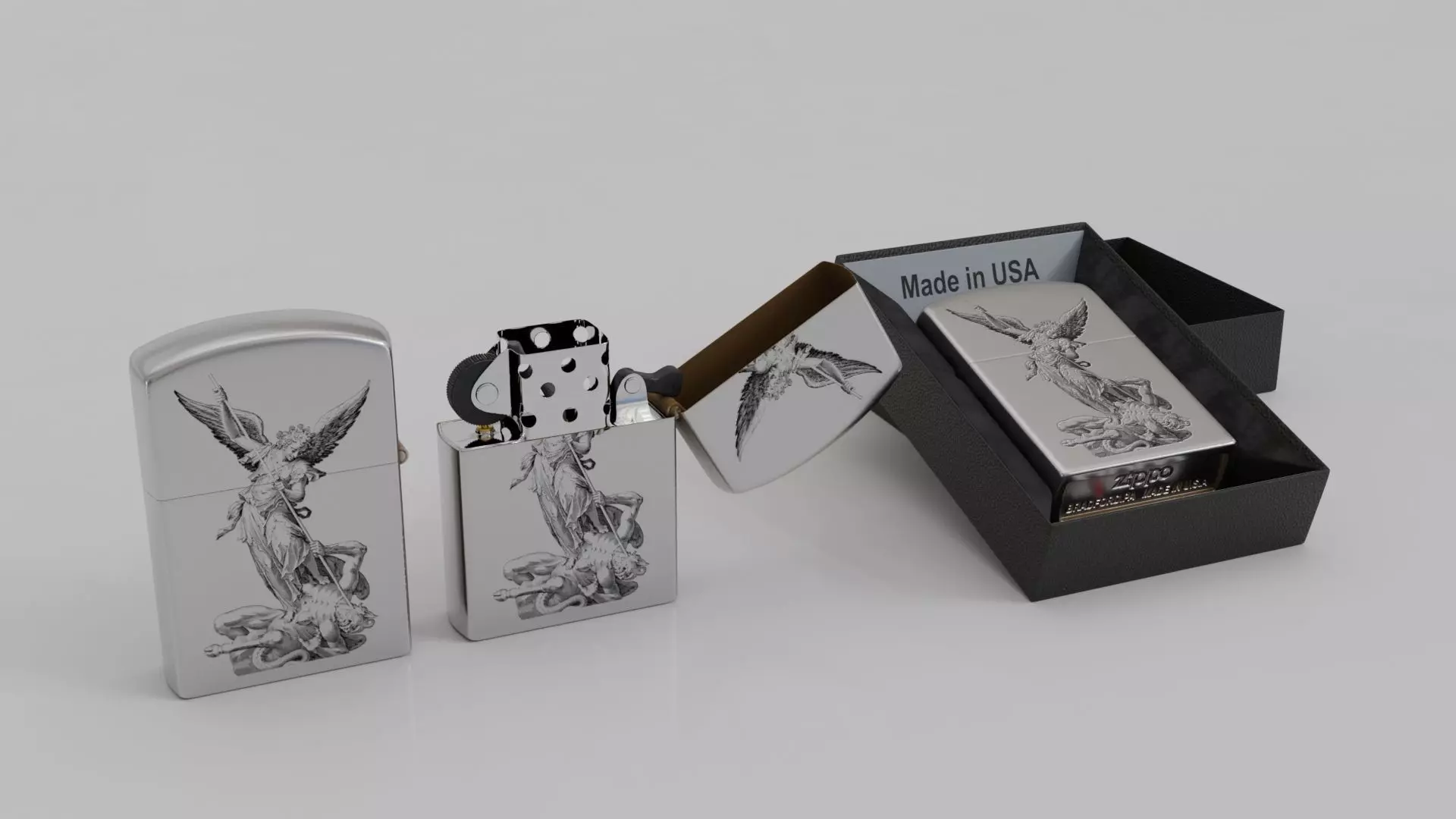 Photorealistic, high-quality model of 'Zippo Lighter with Saint Michael defeating Satan Design' Originally modeled in Blender 4.1. The model is suitable for Ultra HD rendering and ready for close up shots advertising, design visualization, etc . The model rendering quality is shown in product previews.