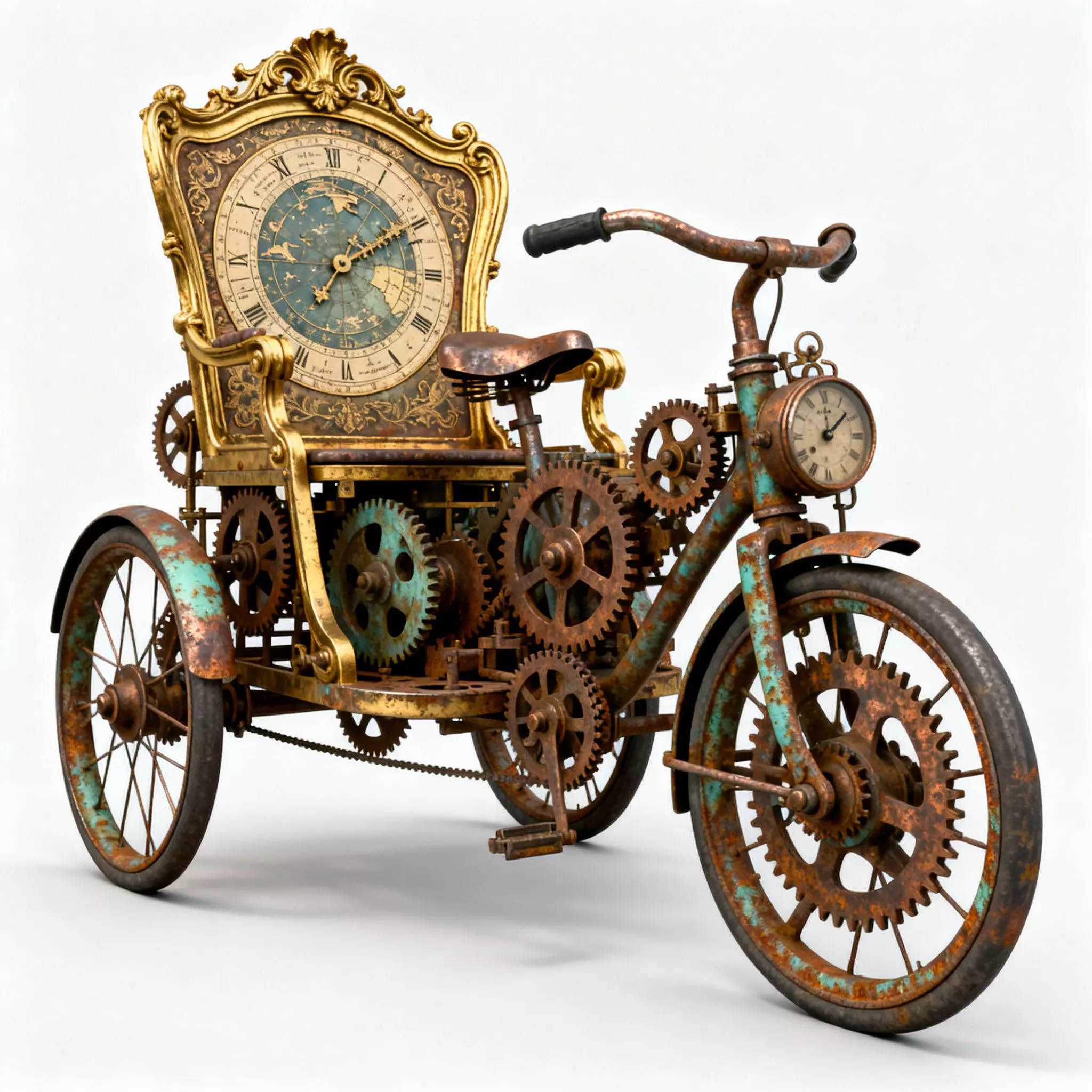 Unique Steampunk Geometry: Combines a classic tricycle silhouette with Victorian furniture and horological components, creating a credible yet fantastical industrial design.