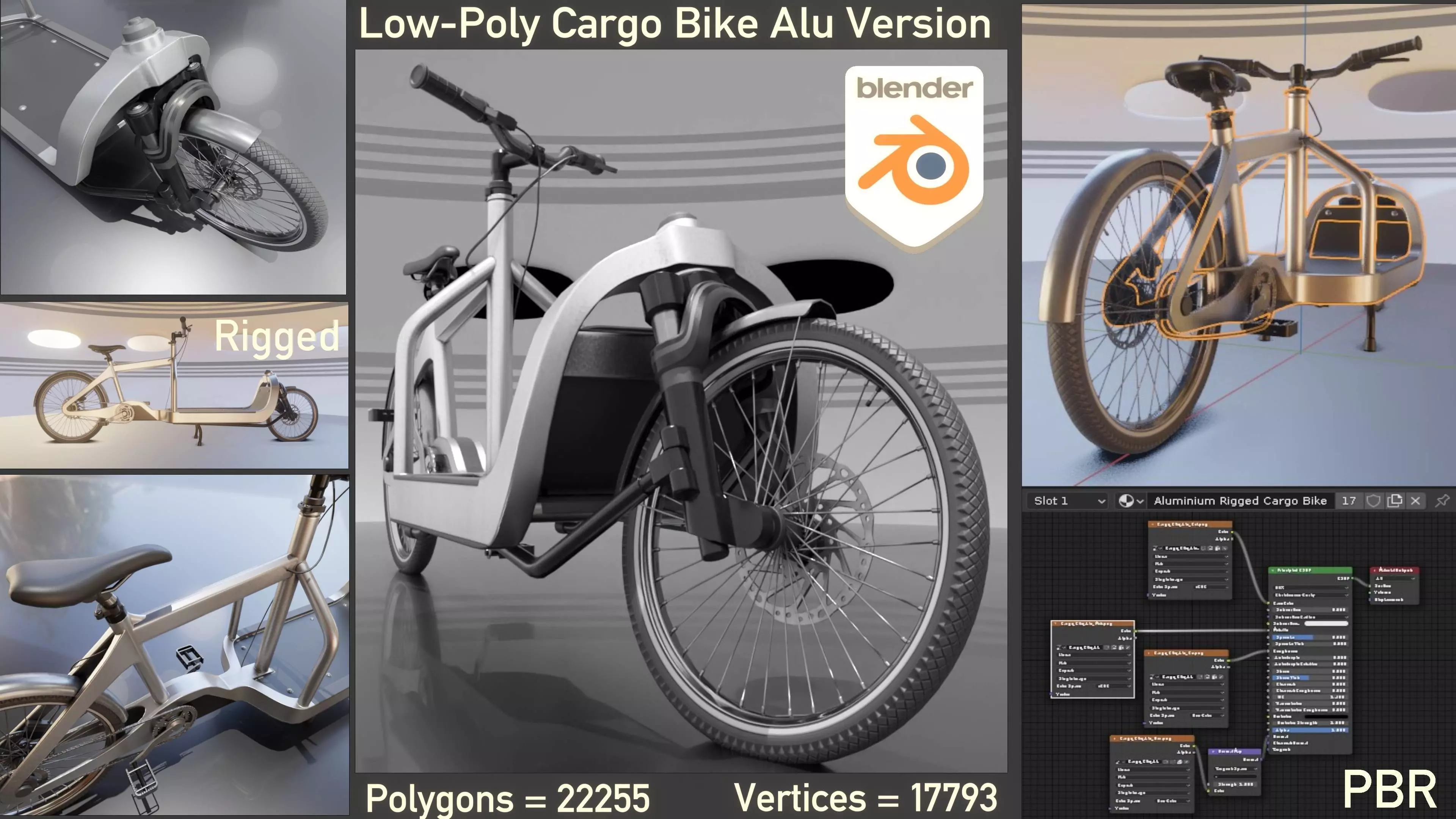 Here is the low-poly and pbr-textured version of the cargo bike with alu frame.