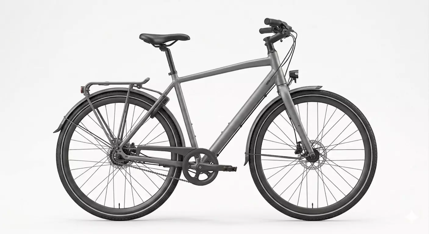 This is a highly detailed 3D render of a modern urban commuter bicycle, presented in a clean studio environment against a seamless white background. The bicycle features a rigid, matte grey frame designed for a comfortable, upright riding position. It is fully equipped for practical city use, including full-coverage front and rear fenders, an integrated rear luggage rack, and powerful front and rear LED lights powered by an internal dynamo or battery system. The bike employs a clean, low-maintenance single-speed drivetrain with a integrated chain guard and efficient disc brakes on both the front and rear wheels for reliable stopping power in all weather conditions. The model showcases meticulous detail, including cable routing and textured components, suitable for high-end product visualization.