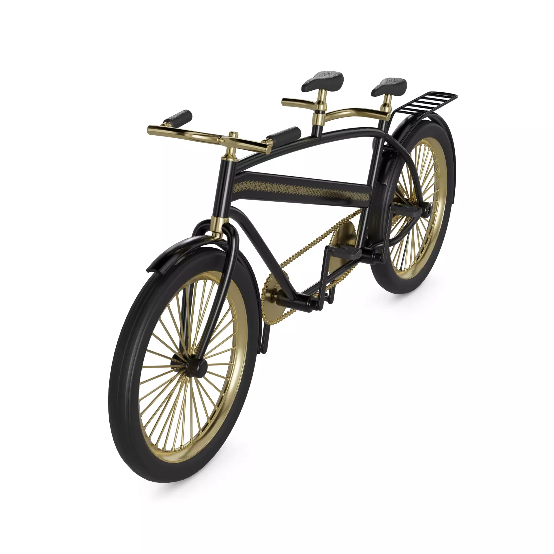 An elegant black tandem bicycle with intricate gold detailing, equipped with a high-tech gear system and adjustable seats, designed for adventurous couples exploring the city streets in the current timeline.