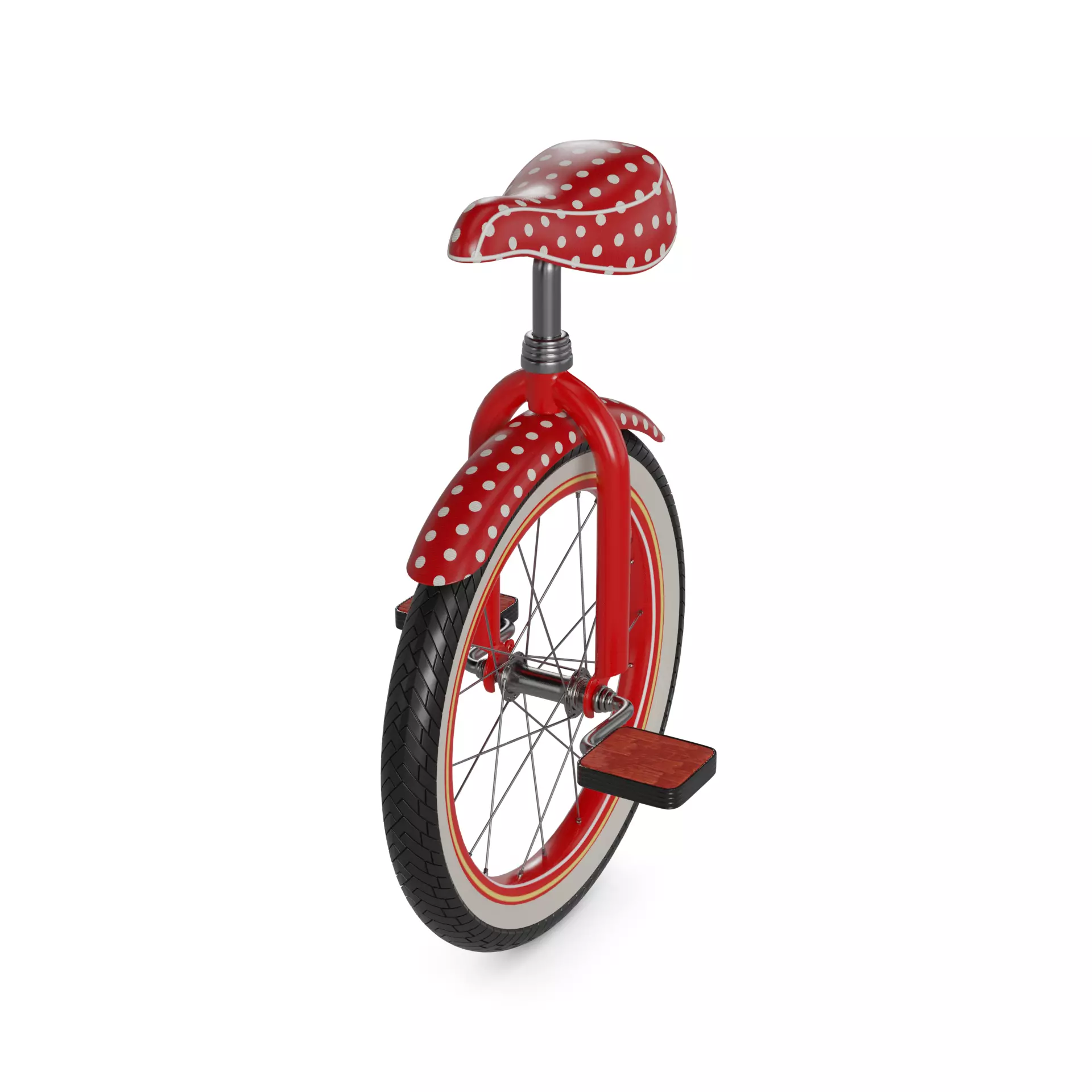An eye-catching unicycle featuring a retro design with a bright red frame and white polka dots, reminiscent of a bygone era, ideal for special purpose activities in the current timeline.