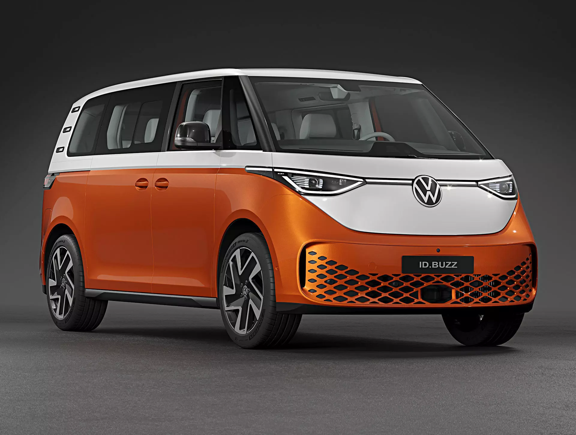 Photorealistic, high-quality and accurate 3D model of 2025 Volkswagen ID. Buzz LWB Orange (Long wheel base, 7-seater) with high detailed interior.