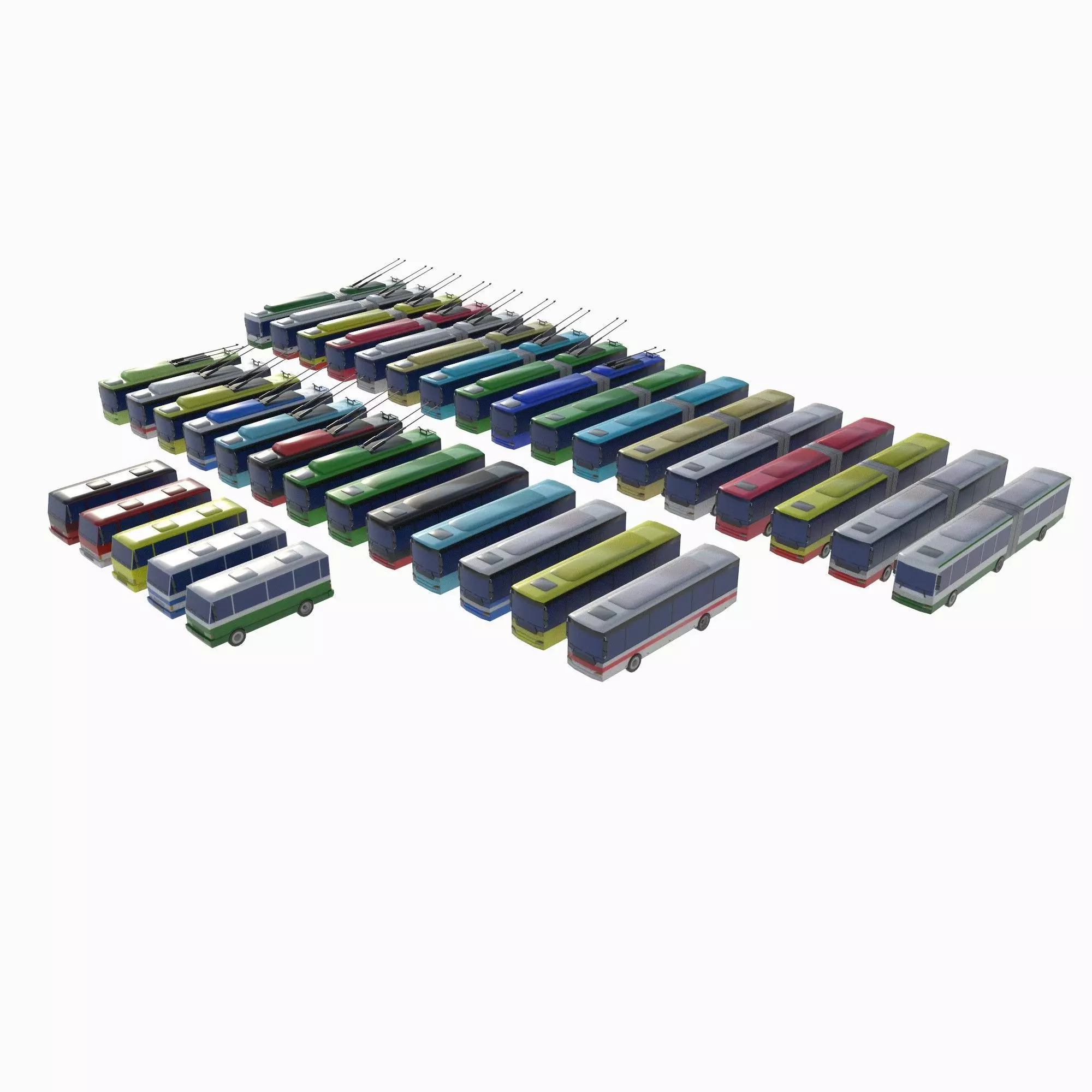 Set of buses and trolleybuses low poly.The set is ready to be introduced into the game.It includes 7 unique objects and 35 modifications and color variations.Each model has from 1900 to 5000 polygons. The entire set consists of 129786 polygons.Models were made in Cinema 4D 2023, converted to 3DS Max, Blender, Unity, Unreal Engine and other formats. Texture palette - jpeg 128x128.