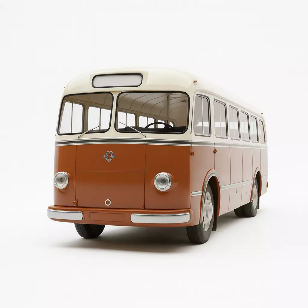 This is a high-quality 3D model of a classic European-style bus with a distinctive retro design. The model features a two-tone paint scheme of deep maroon/brown on the lower body and cream/white on the roof and window lining, capturing the aesthetic of public transportation vehicles from the mid-20th century. Notable design elements include large, round headlamps, a prominent chrome bumper, split windshields, and multiple side windows. The model is rendered in a clean, studio-like environment with soft, directional lighting, highlighting its smooth surfaces and realistic proportions. This asset is ideal for projects requiring a touch of nostalgia, such as historical visualizations, game environments, or digital collectibles.