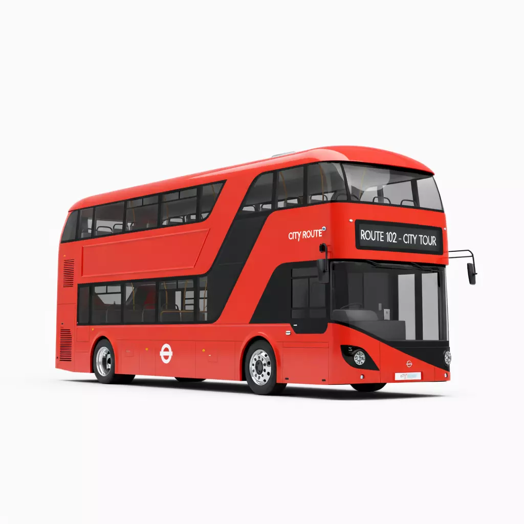 This high-fidelity 3D model depicts a modern red double-decker bus, specifically designed for urban sightseeing and city tours. The vehicle features a sleek, aerodynamic front profile with large panoramic windows on both levels to provide passengers with optimal views of the city. The exterior is finished in a vibrant, classic red with black accents around the window frames and a digital destination sign displaying ROUTE 102 - CITY TOUR. Detailed with realistic headlights, side mirrors, and multi-spoke transit wheels, this asset is an excellent choice for architectural visualizations, urban environment simulations, or digital twin projects focused on public transportation.