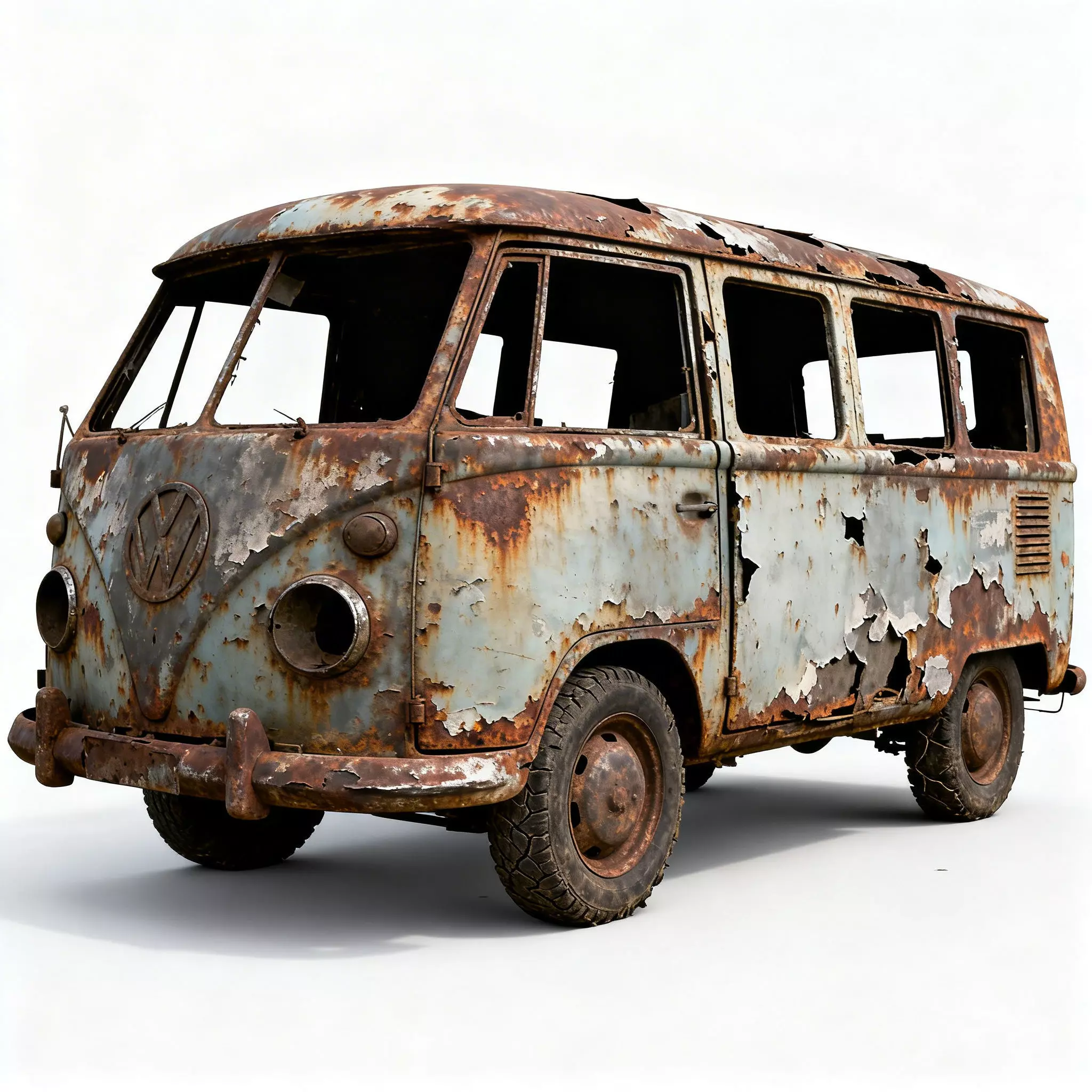 Hollowed-Out Interior and ViewportsThe microbus features a completely hollowed-out interior with missing glass in all viewports, leaving the dark internal cabin exposed. The side bodywork is riddled with jagged metallic breaches and holes, reinforcing the asset's status as a long-abandoned and non-functional piece of hardware that has been stripped of its functional components.