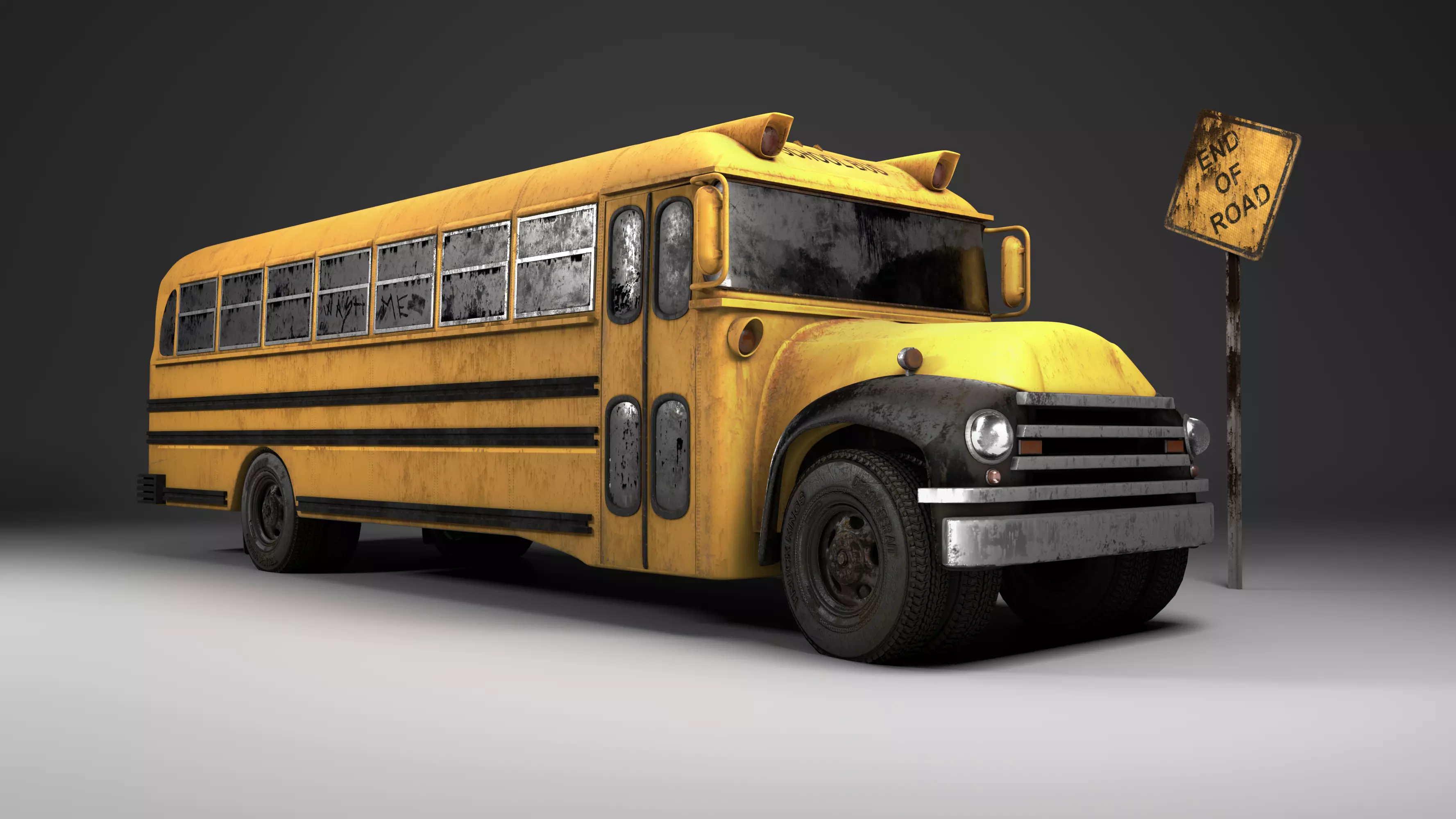 Old yellow schoolbus with the end Of road sign included. The two front wheels are rigged. While moving the schoolbus, the wheels will rotate with it.