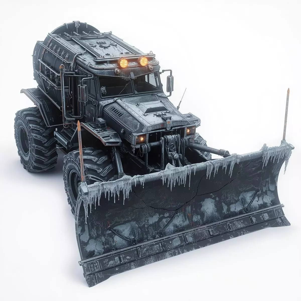 Tagsbulldozer, custom car, interceptor, snow plow, winter vehicle, 3d model, game asset, weathered metal, frozen, icicles, rugged design, off road, realistic car, custom vehicle, cinematic prop, 3d prop, armored car, wasteland car, arctic transport, heavy machinery