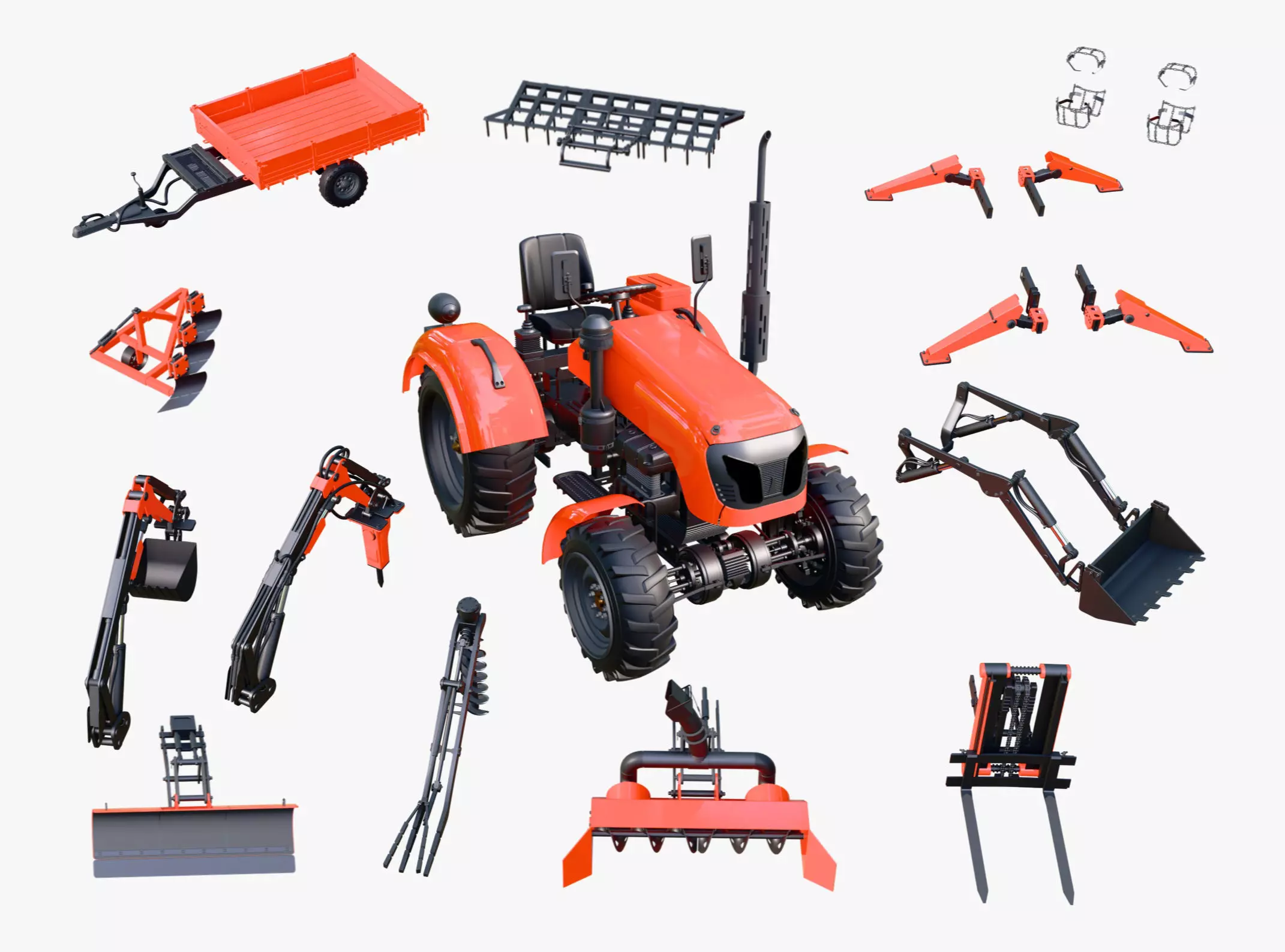 Ultimate model pack of a compact tractor with a wide selection of attachments. Bright orange mini-tractor with an open cabin and massive wheels is complemented by contrasting black elements. The comprehensive set includes numerous functional modules: a trailer, snow blower, snow plow, drag harrow, plow, forklift forks, excavator arms, hole digger, hydraulic breaker, outrigger stabilizers, and wheel chains.