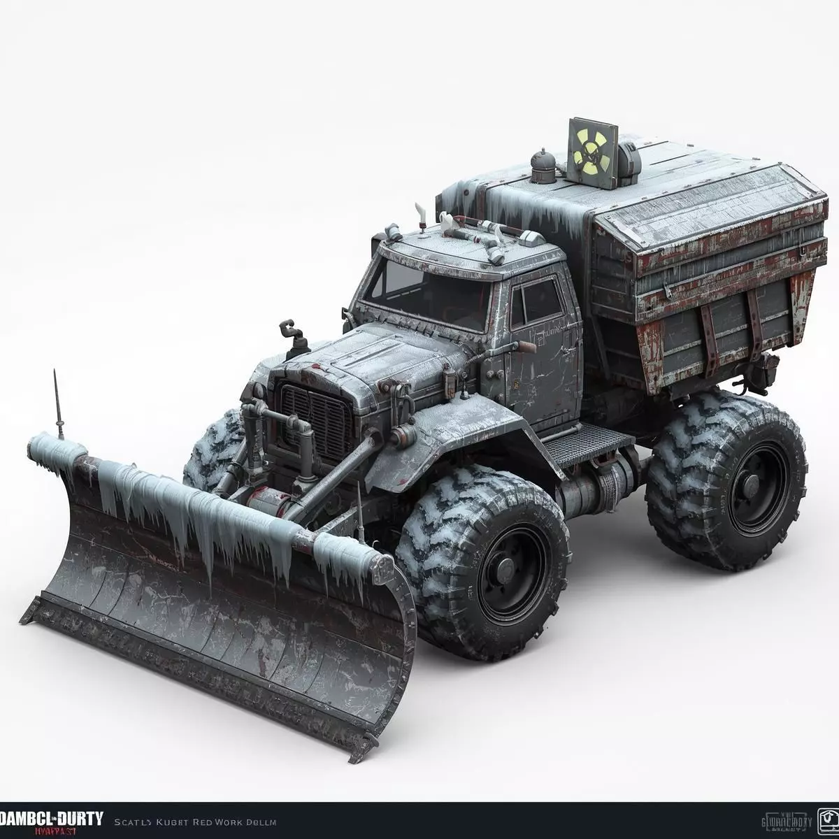 Meticulously crafted for game development and cinematic renders, the model includes advanced PBR textures that capture the contrast between frozen metallic surfaces and worn rubber. Key details include mud-and-snow-caked oversized all-terrain tires, a rear utility cargo bed with protective wooden-slat reinforcement, and a roof-mounted specialized hazard beacon. This asset is an ideal choice for creators looking for a unique, high-impact vehicle for survival-horror, winter wasteland, or supernatural industrial scenes.