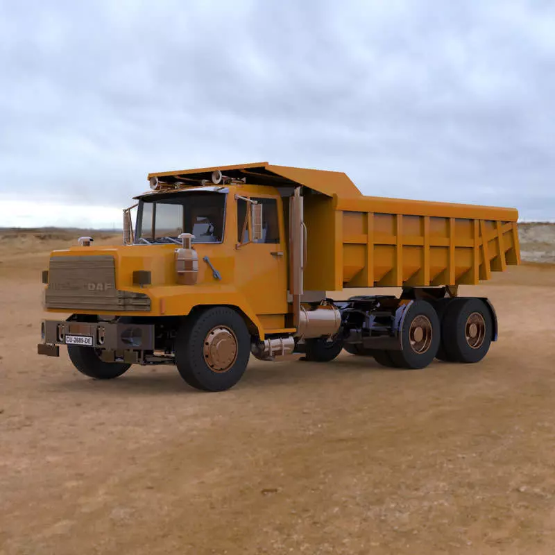A dump truck or production truck is a truck used for transporting loose material (such as sand, gravel, or dirt) for construction. A typical dump truck is equipped with a hydraulically operated open-box bed hinged at the rear, the front of which can be lifted up to allow the contents to be deposited on the ground behind the truck at the site of delivery. In the UK the term applies to off-road construction plant only, and the road vehicle is known as a tipper.