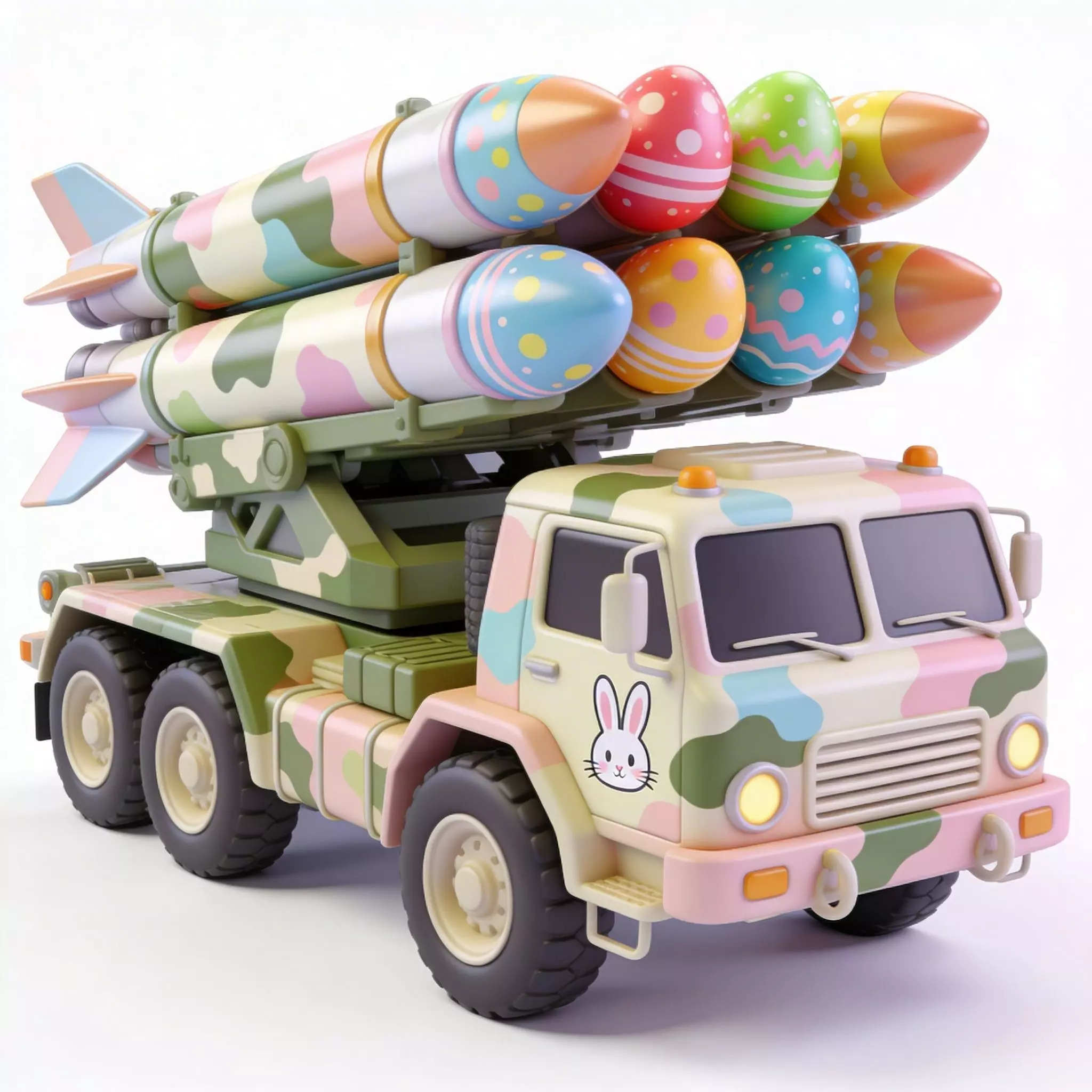 TAGSRocket Launcher, 3D Model, Easter, Military Vehicle, Pastel Camo, Festive, Holiday, Egg Missile, Missile Launcher, Truck, Stylized, Animation Asset, Rendering, Digital Art, Game Dev, Cute, Whimsical, Spring, Bunny Decal, Creative, High Detail, Industrial, Toy-like, Colorful, Multi-color, Seasonal, Fun.