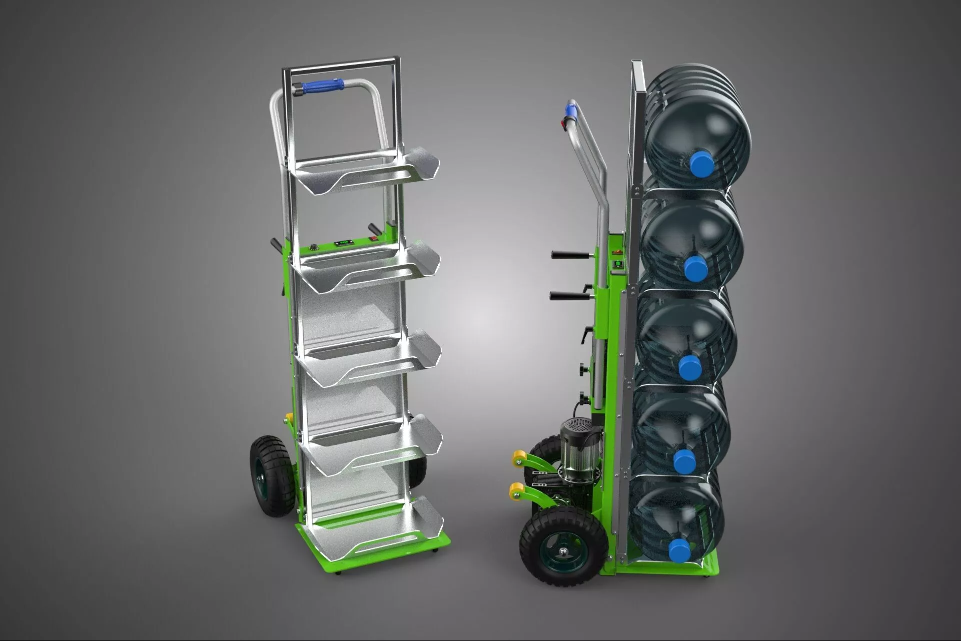 This high-fidelity 3D model represents a specialized electric-powered handtruck designed for the ergonomic transport of heavy-duty water gallon jugs. Engineered for industrial and commercial environments, the device integrates a robust electric motor assembly within a reinforced steel frame. The motorized system facilitates the efficient movement of multiple five-gallon water bottles, significantly reducing the manual labor and physical strain typically associated with hydration delivery services and warehouse logistics. Key features of the model include a precision-engineered drive system, high-traction pneumatic wheels, and a specialized cradle platform optimized for the cylindrical geometry of standard water containers. The control interface situated on the ergonomic handle includes throttle mechanisms and safety braking systems, all rendered with meticulous attention to detail. This model is ideal for architectural visualizations, logistical simulations, and industrial design demonstrations. It showcases intricate mechanical components such as the battery compartment, wiring conduits, and torque-optimized motor housing. The design emphasizes stability and maneuverability, allowing for efficient navigation through narrow corridors and office spaces. Each component is modeled with accurate proportions and high-resolution textures, making it suitable for close-up renderings and technical presentations in professional 3D environments.