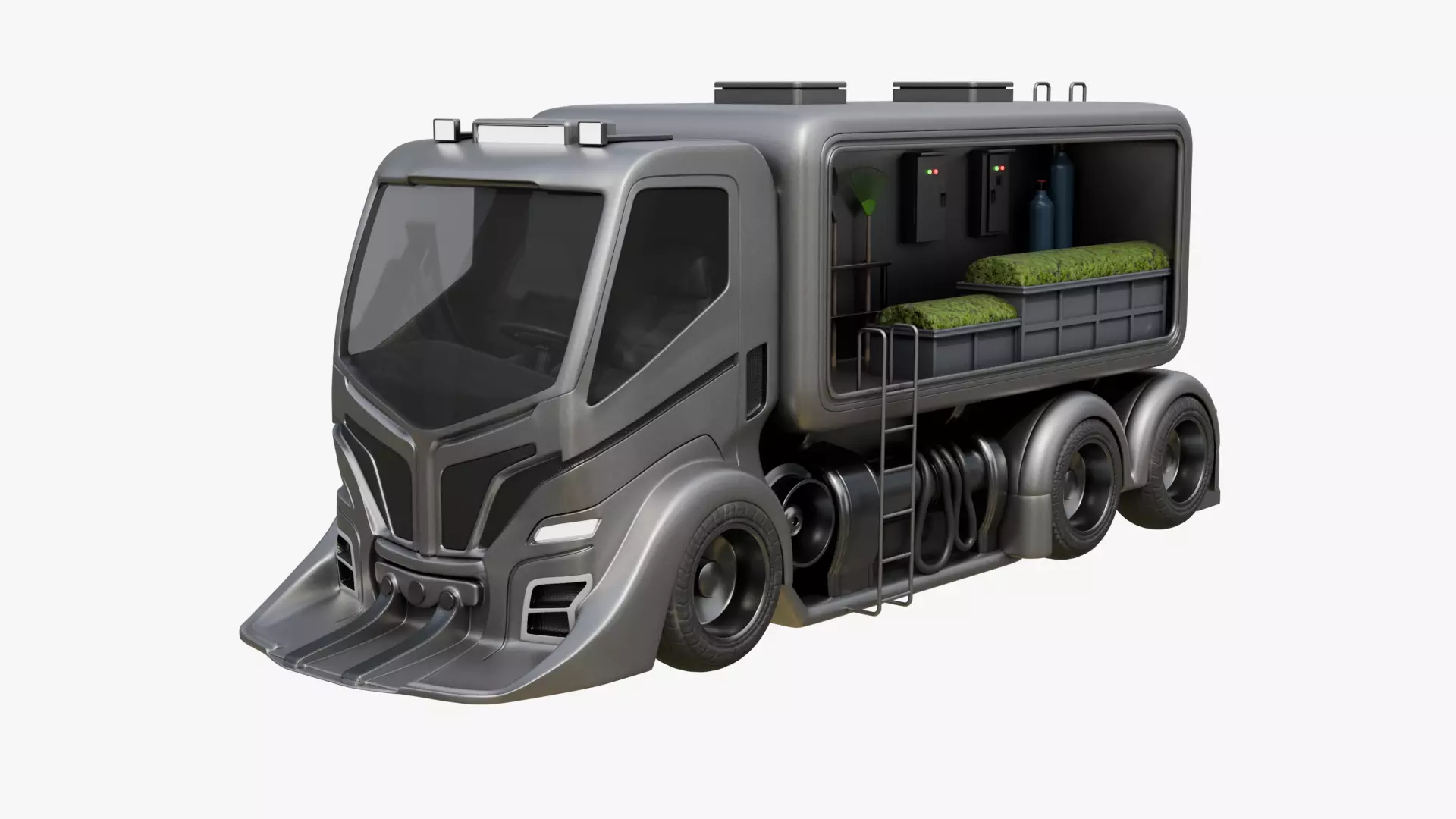 This landscaping truck proves invaluable in cinematic sequences that demand high-tech urban or suburban environments. Its large cargo bed and compartmentalized design underscore the functional value of advanced maintenance vehicles, emphasizing efficiency, mobility, and adaptability to a variety of landscaping scenarios. The transparent windows afford viewers insight into the automated control systems, thus enhancing the scene's realism and technological intricacy, while the neon green accents offer a distinctive aesthetic appeal that reinforces the futuristic thematic element.